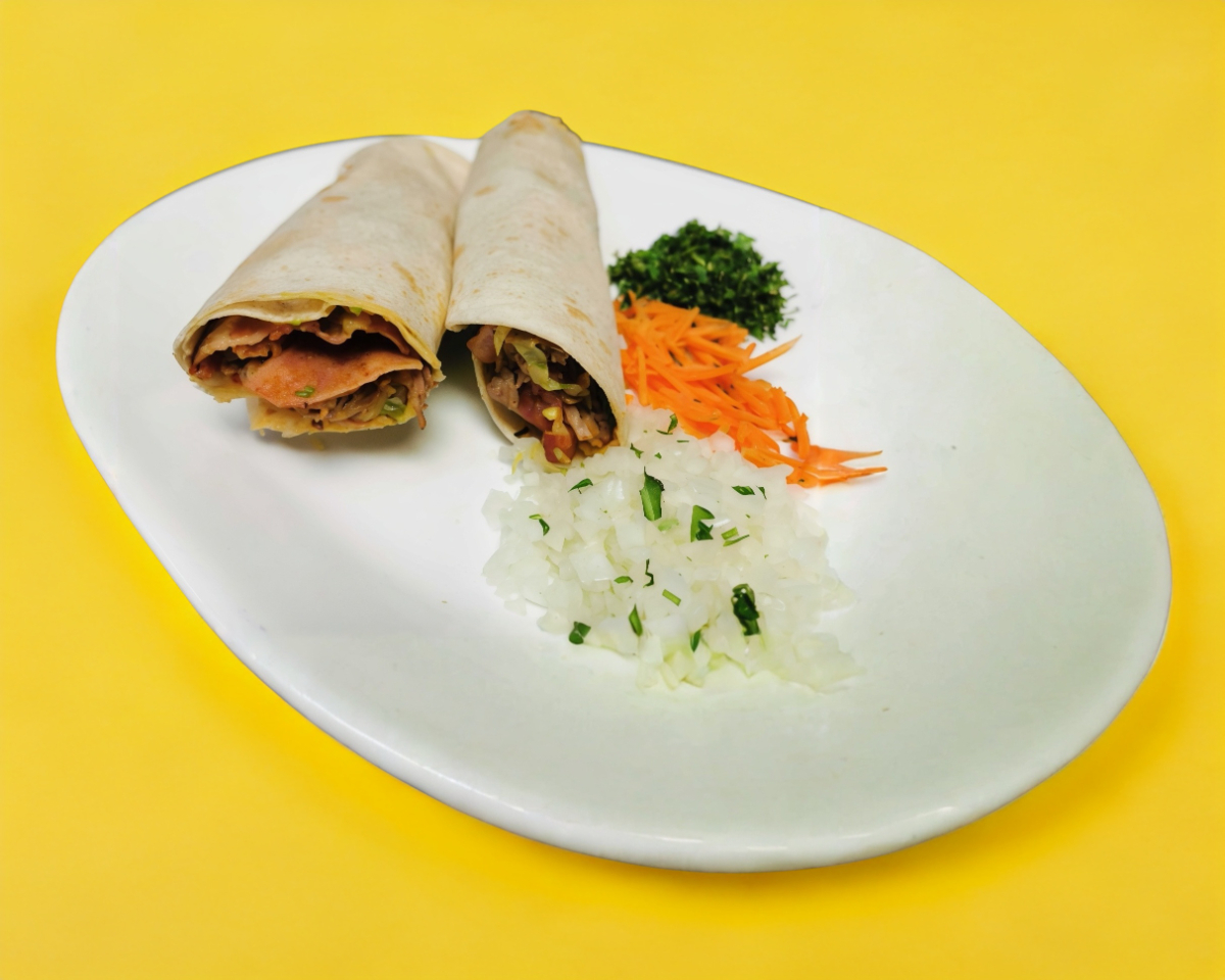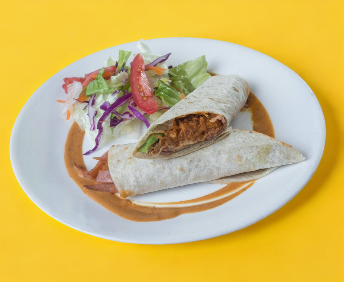 2 Tortilla de harina, asada, deshebrada, jamón, tocino, frijoles, lechuga y aguacate.