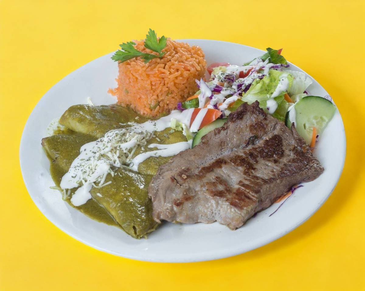 Bistec asado, 2 enchiladas verdes, arroz y ensalada.