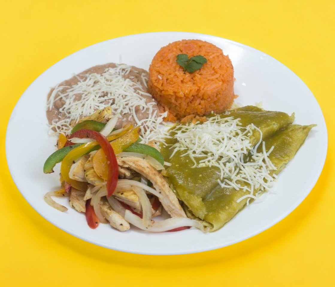 Fajitas de pollo, 2 enchiladas verdes, arroz y frijoles.