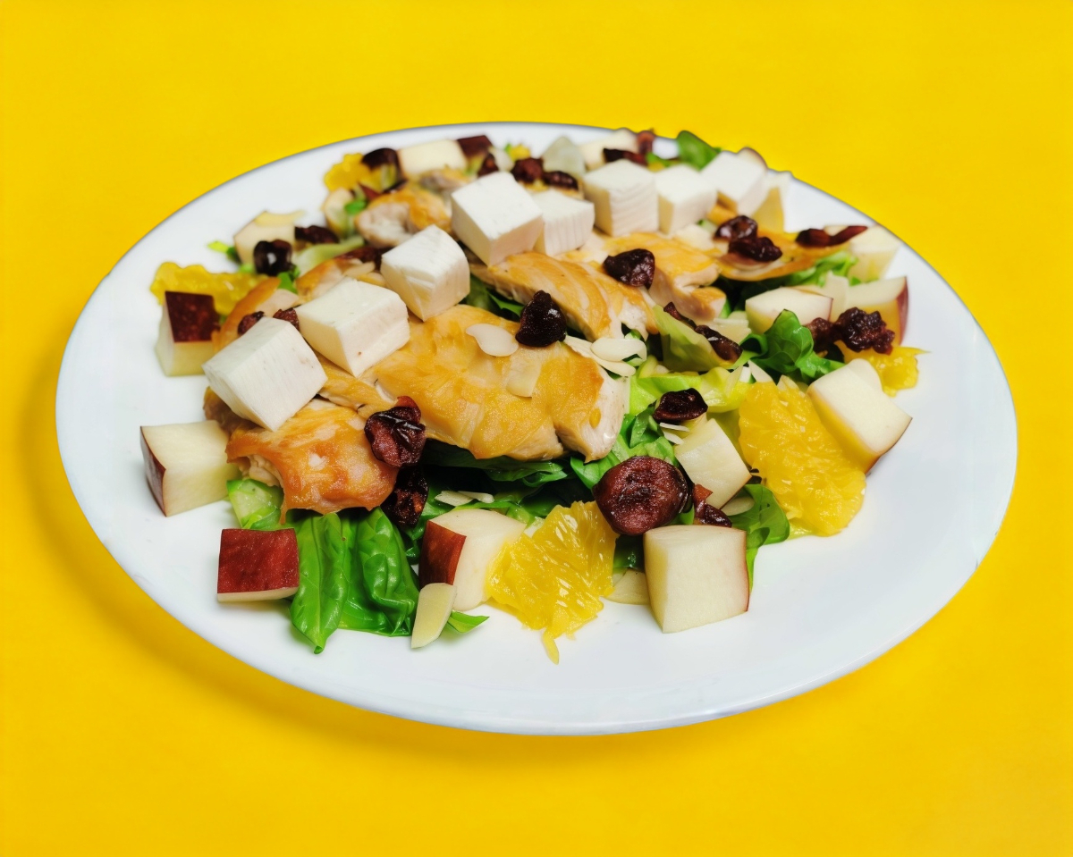 Fajitas de pollo a la plancha, lechuga, espinacas, manzana, naranja, queso panela.