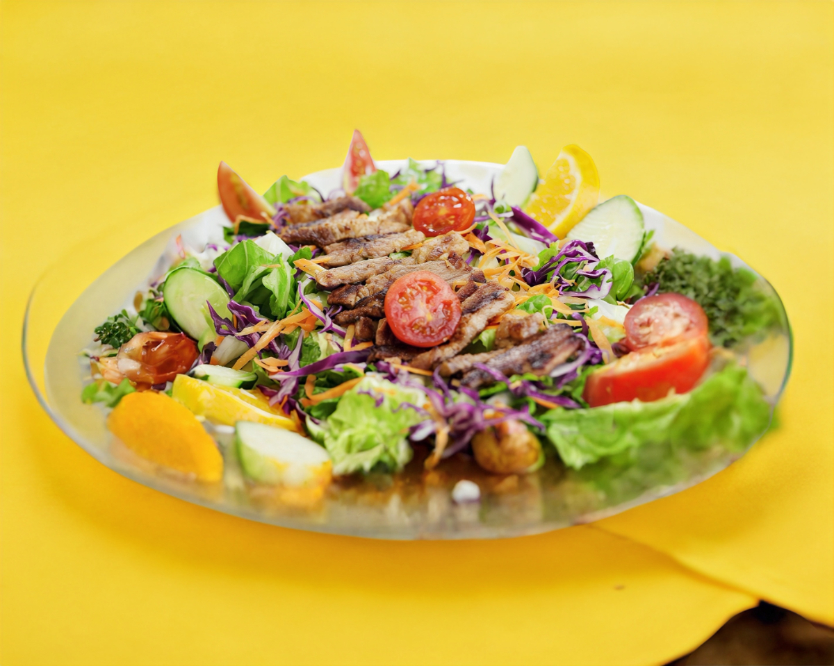 Fajitas de carne asada, lechuga, espinacas, tomate y pepino.