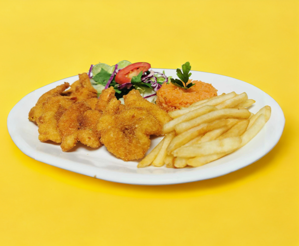 Camarones empanizados, arroz, ensalada y papas fritas.