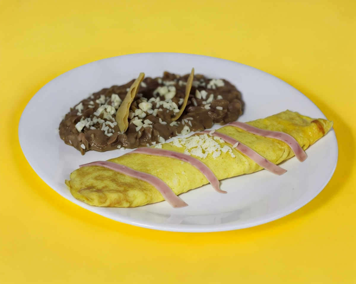 Tortilla de huevo rellana de deshebrada, jamón y queso, envuelto en una tortilla de harina y bañado en salsa chipotle.