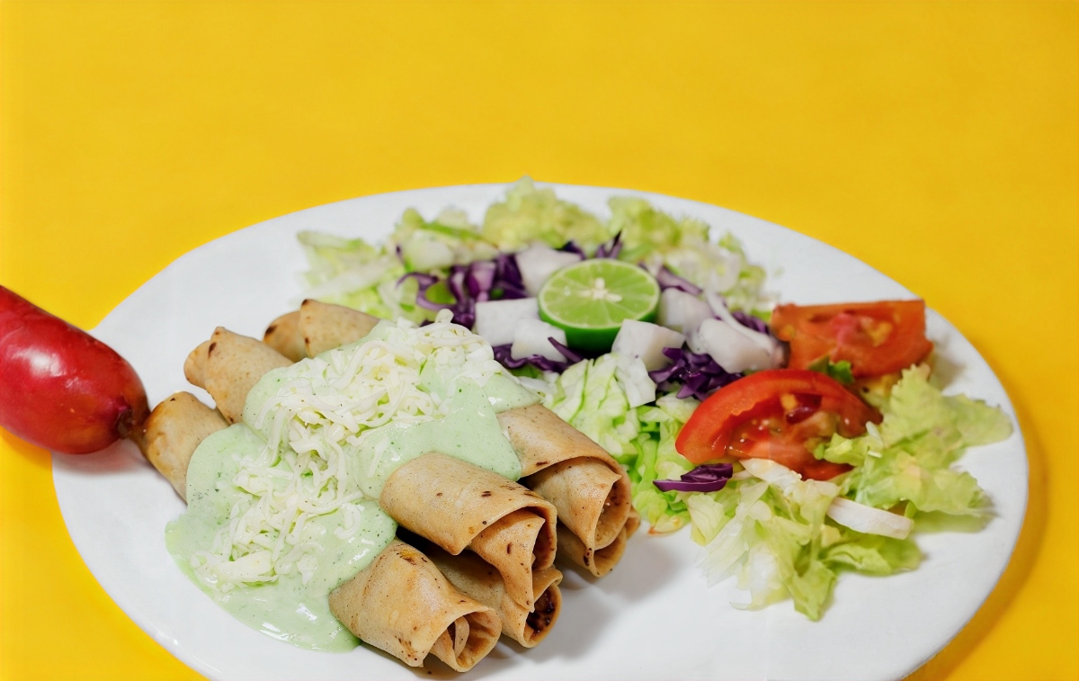Tacos de deshebrada, en una cama de ensalada, bañados en salsa verde cremosa