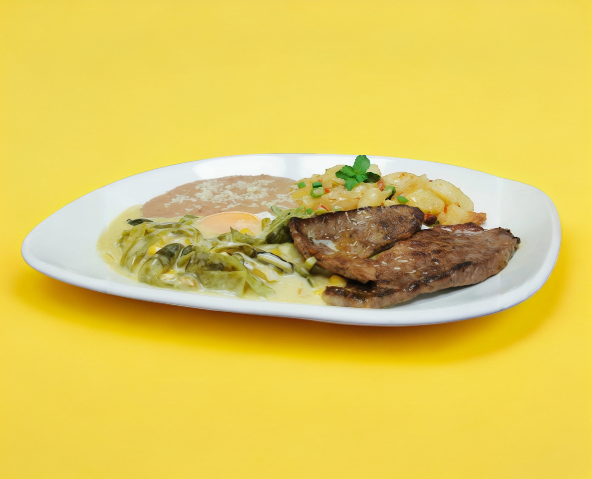 Bistec a la plancha, huevo revuelto con salsa, papas a la mexicana y frijoles refritos.