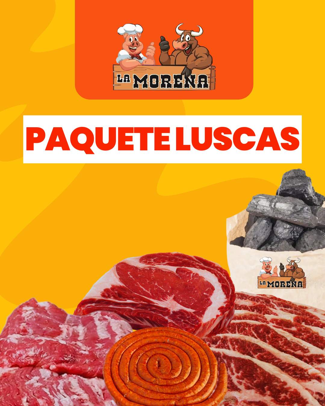 ¡Para las familias más grandes! Incluye 3 kilos de chuleta de res, 1 kilo de costilla, 1 paquete de salchicha para asar, 1 paquete de carbón.