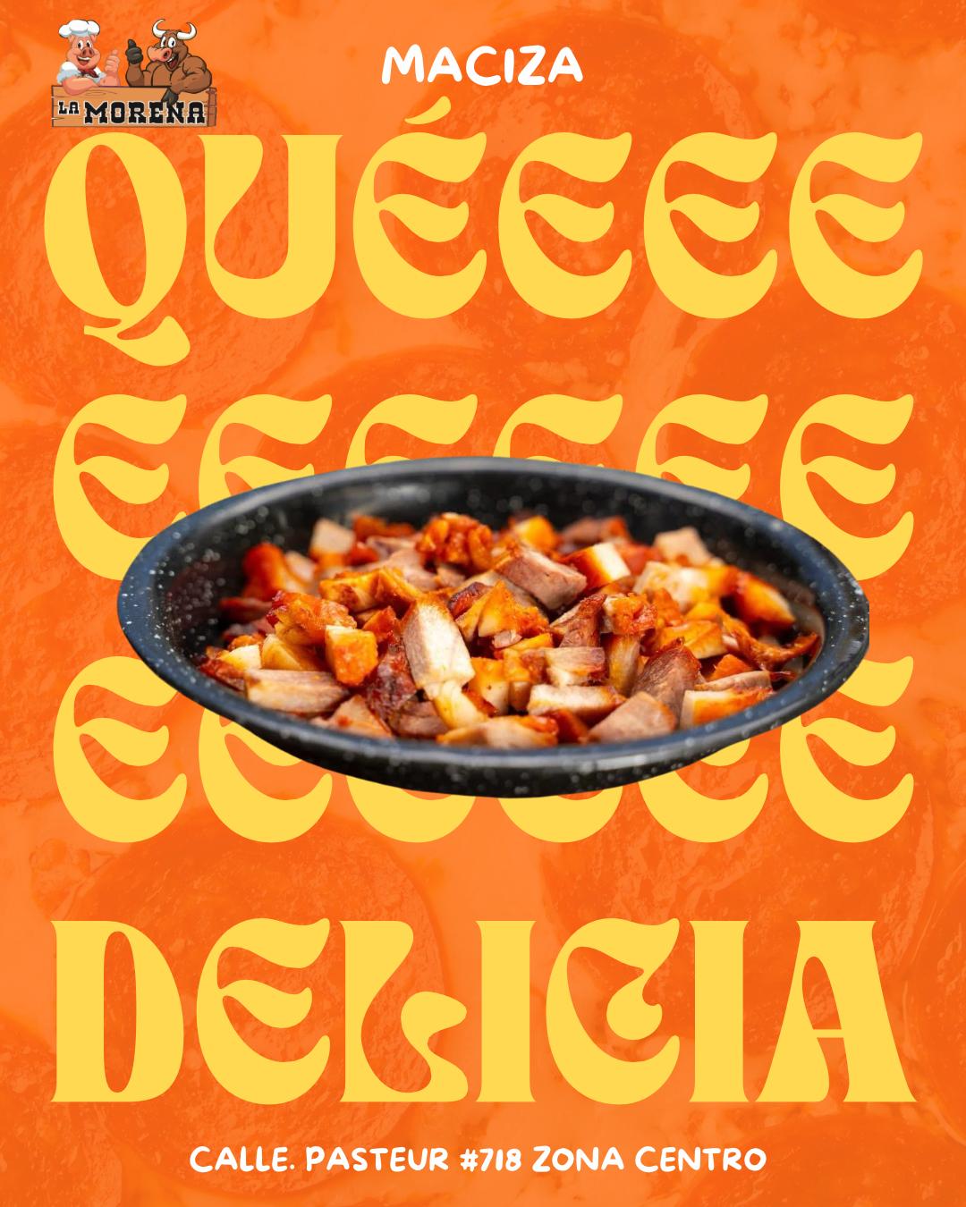 eliciosa carne maciza de cerdo, 1 kilo, acompañado de tortillas, salsa, cebolla y cilantro.