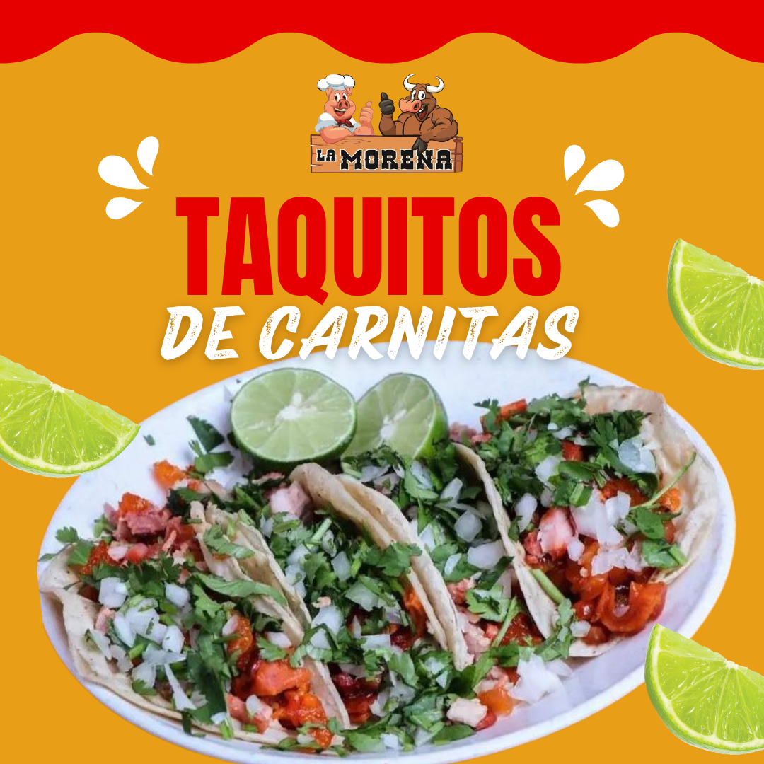 5 taquitos de carnitas .Deliciosos taquitos hechos con carnitas suaves y jugosas .Acompañados de salsa picante ,cebolla ,cilantro y servidos con tortillas calientitas .