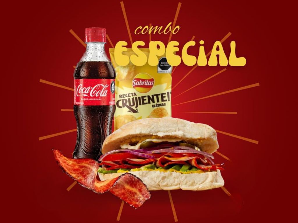 Combo individual ideal para la hora de comida .Torta de pierna (doble tocino crujiente , queso en costra fundido , aguacate fresco , lechuga, mayonesa, mostaza, chiles), más refresco 400 ml y Sabritas.