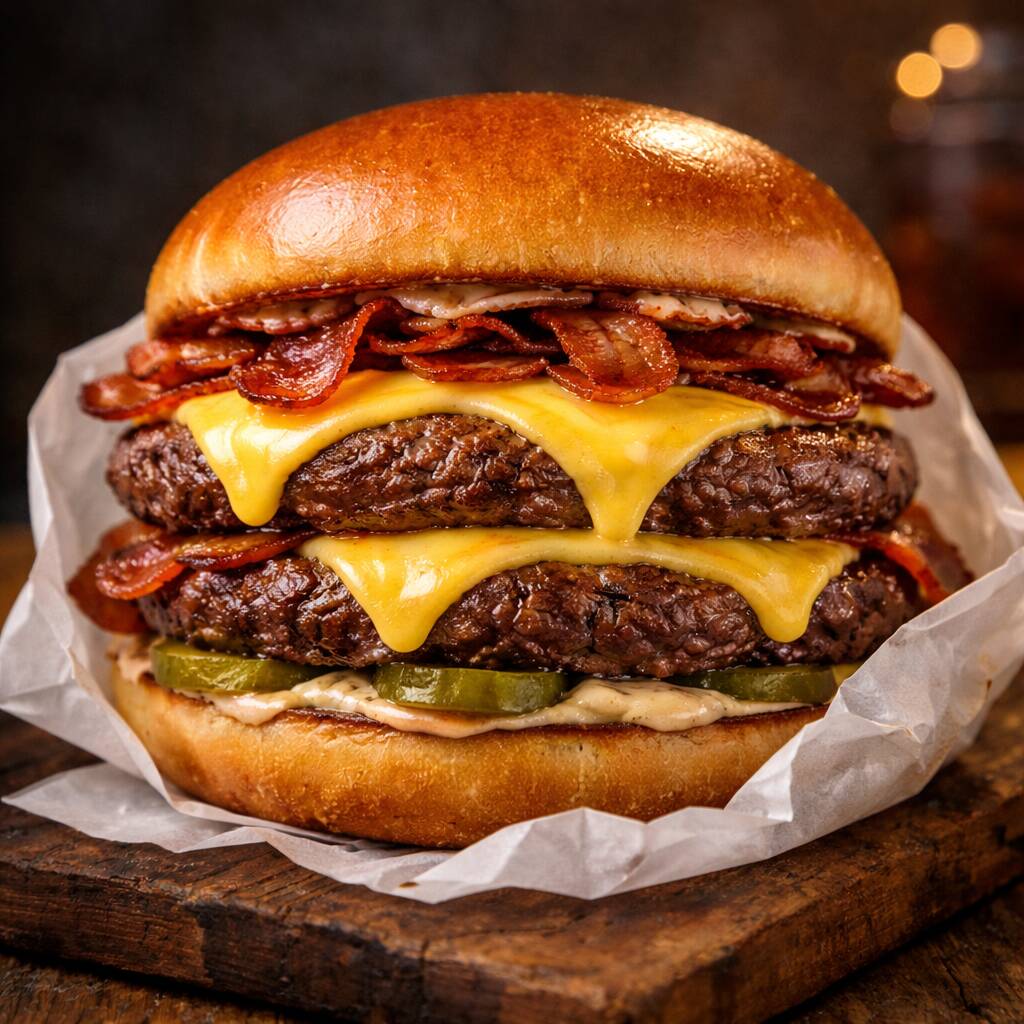 Hamburguesa con doble carné de res jugosa con doble queso, doble tocino crujiente, salsa especial cremosa y pan dorado. Intensa, llenadora y muy sabrosa.