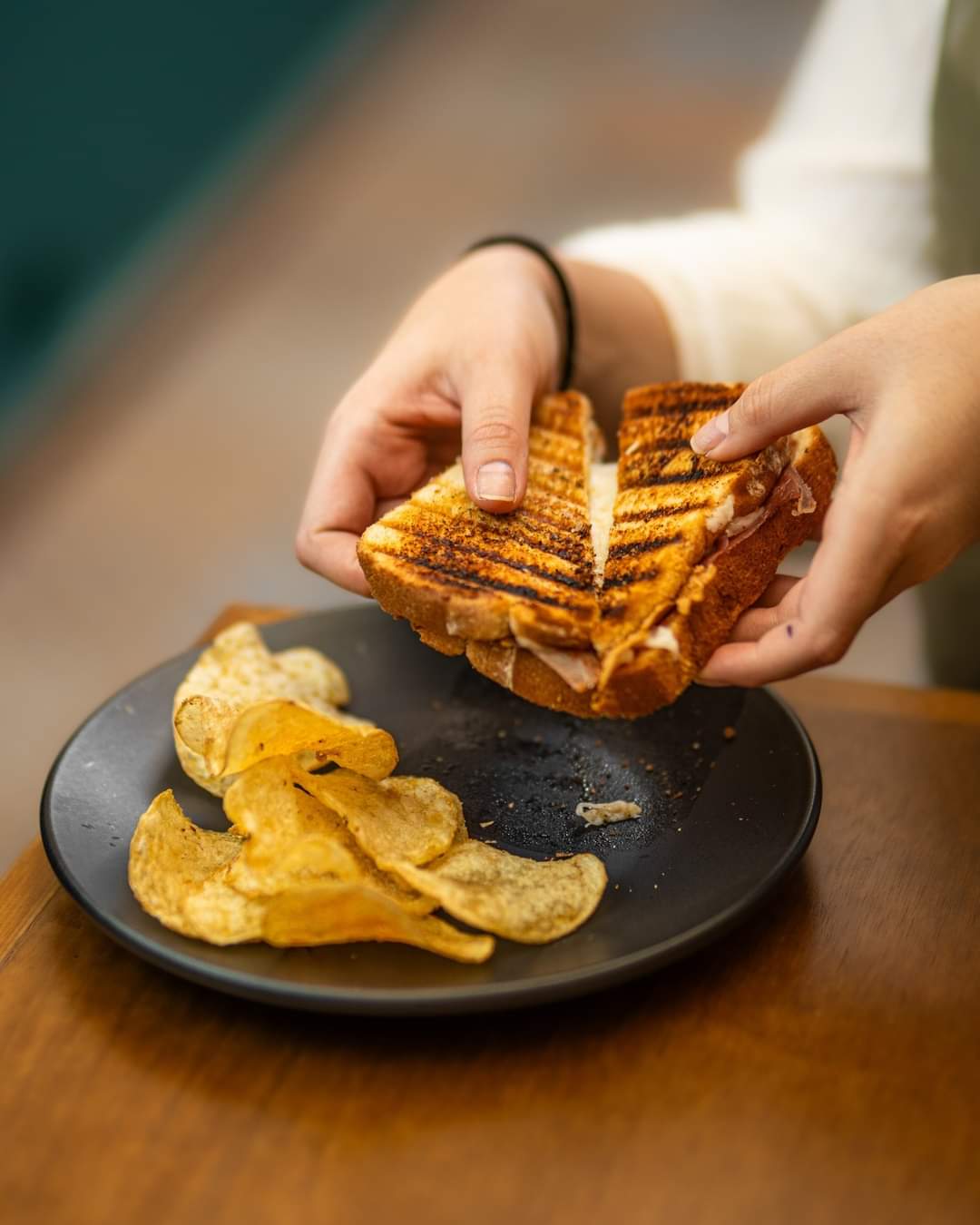 Pan Tostado con Queso y Jamón Serrano. Acompañado de papas Fritas