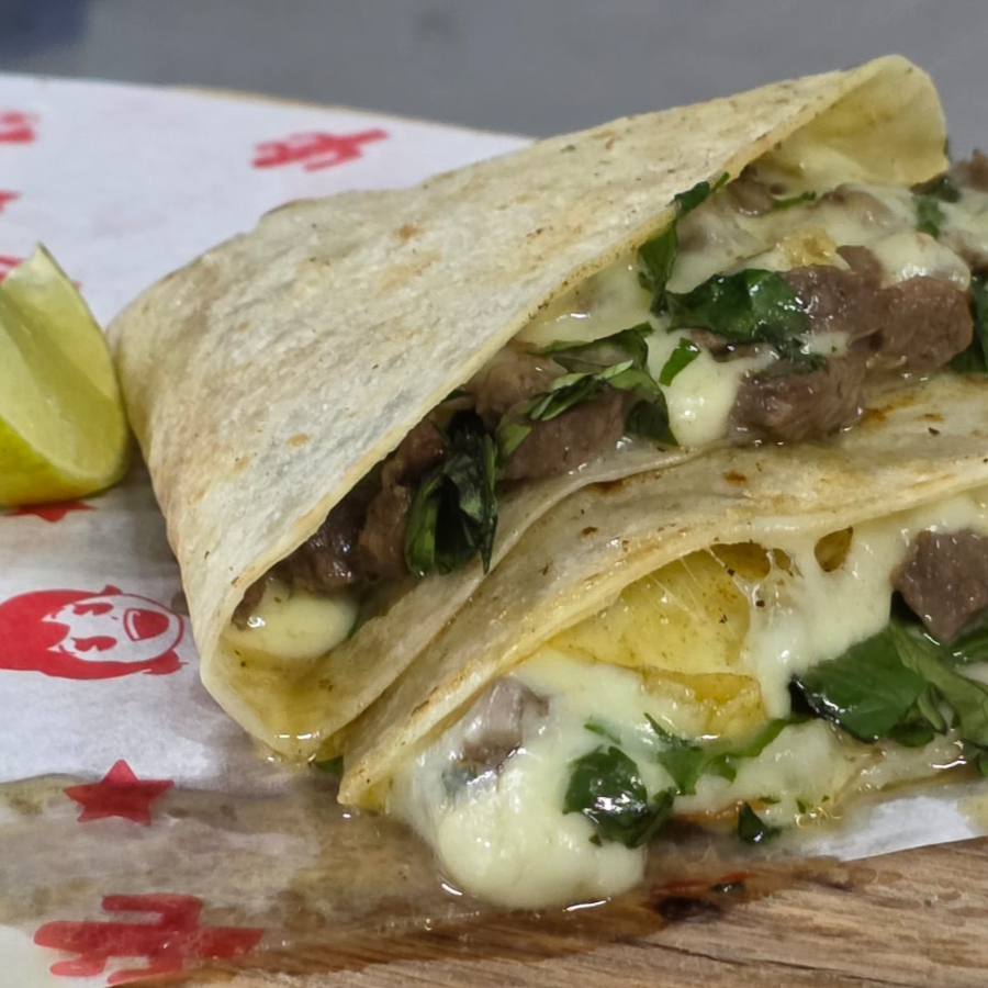 Tortilla grande de harina con carne al gusto, queso fundido y salsita especial. 👉 Elige tu carne: pastor, asada ,pastor negro, tripa o pollo.
