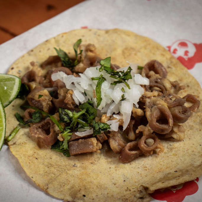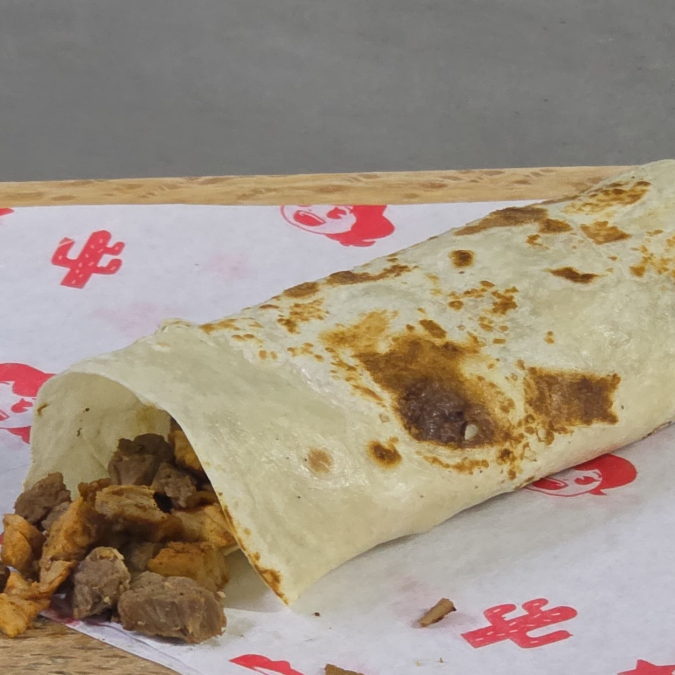 Tortilla grande rellena solo de lo bueno: tu carne favorita, cebolla, cilantro 👉 Elige tu carne: pastor, asada, suadero o pollo.