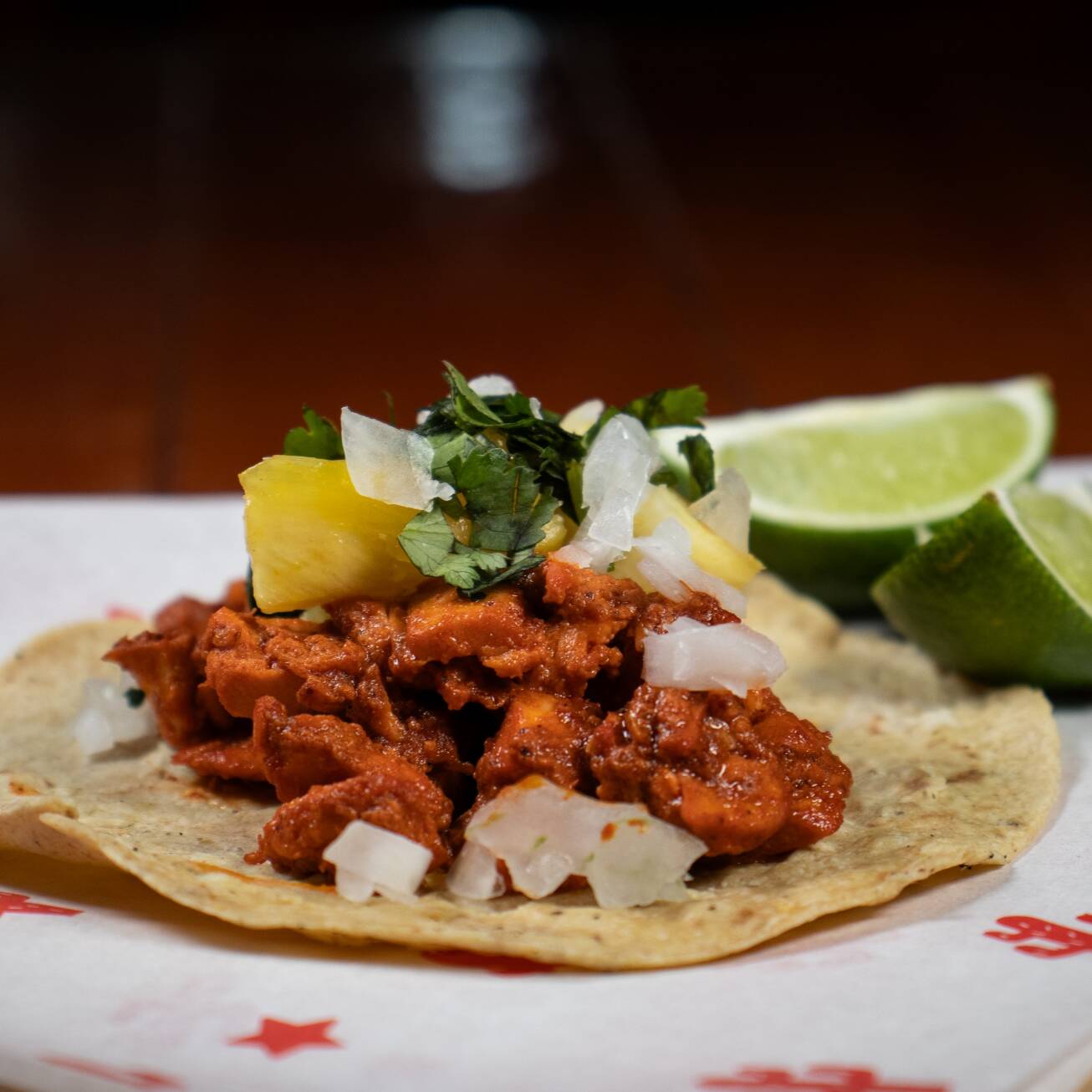 El Clasico , Taco clásico de cerdo marinado al pastor, jugoso y dorado, con piña, cebolla y cilantro sobre tortilla recién hecha.