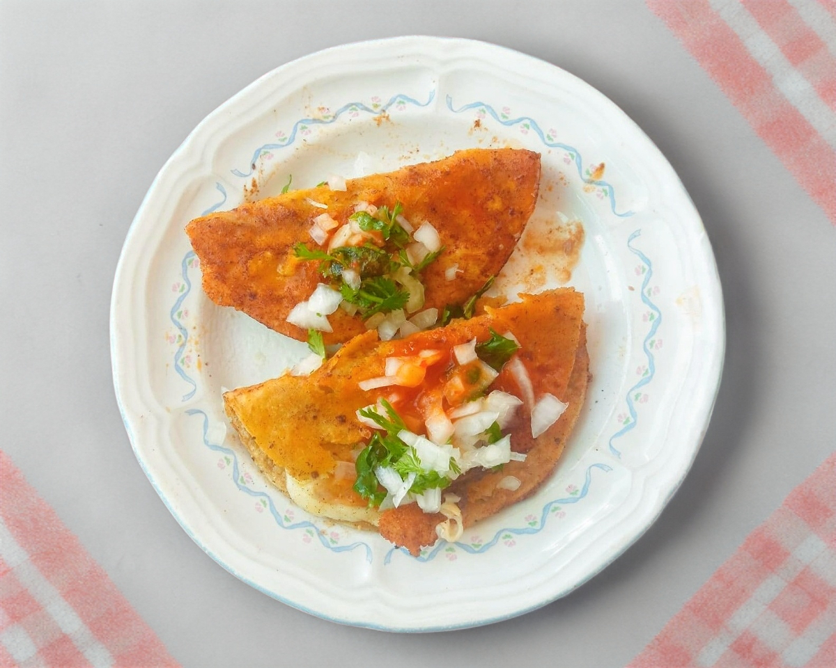 5 quesabirrias: tortilla de maiz semidorada, con barbacoa, queso, cebolla con cilantro y salsa.