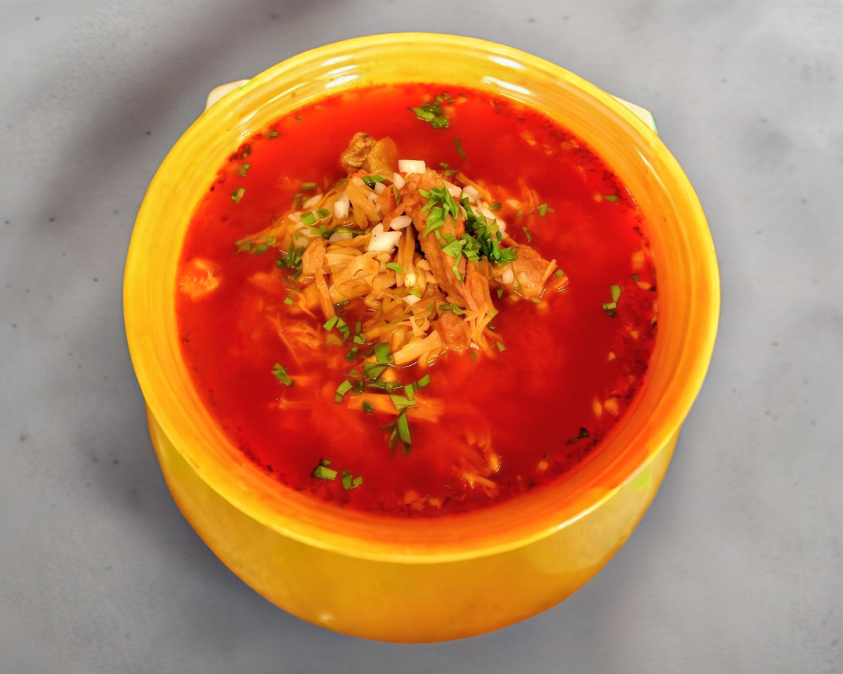 Pasta de ramen cocida en consome de mirria, barbacoa, cebolla con cilanto y salsa.