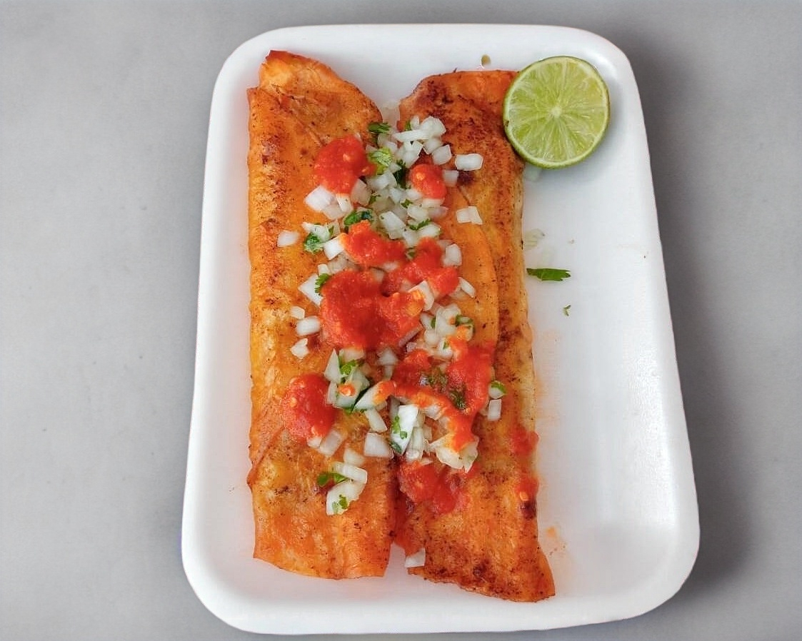 C/5 Tortilla de maíz, queso, marlín gusado con pico de gallo, salsa roja, cebolla con cilantro.
