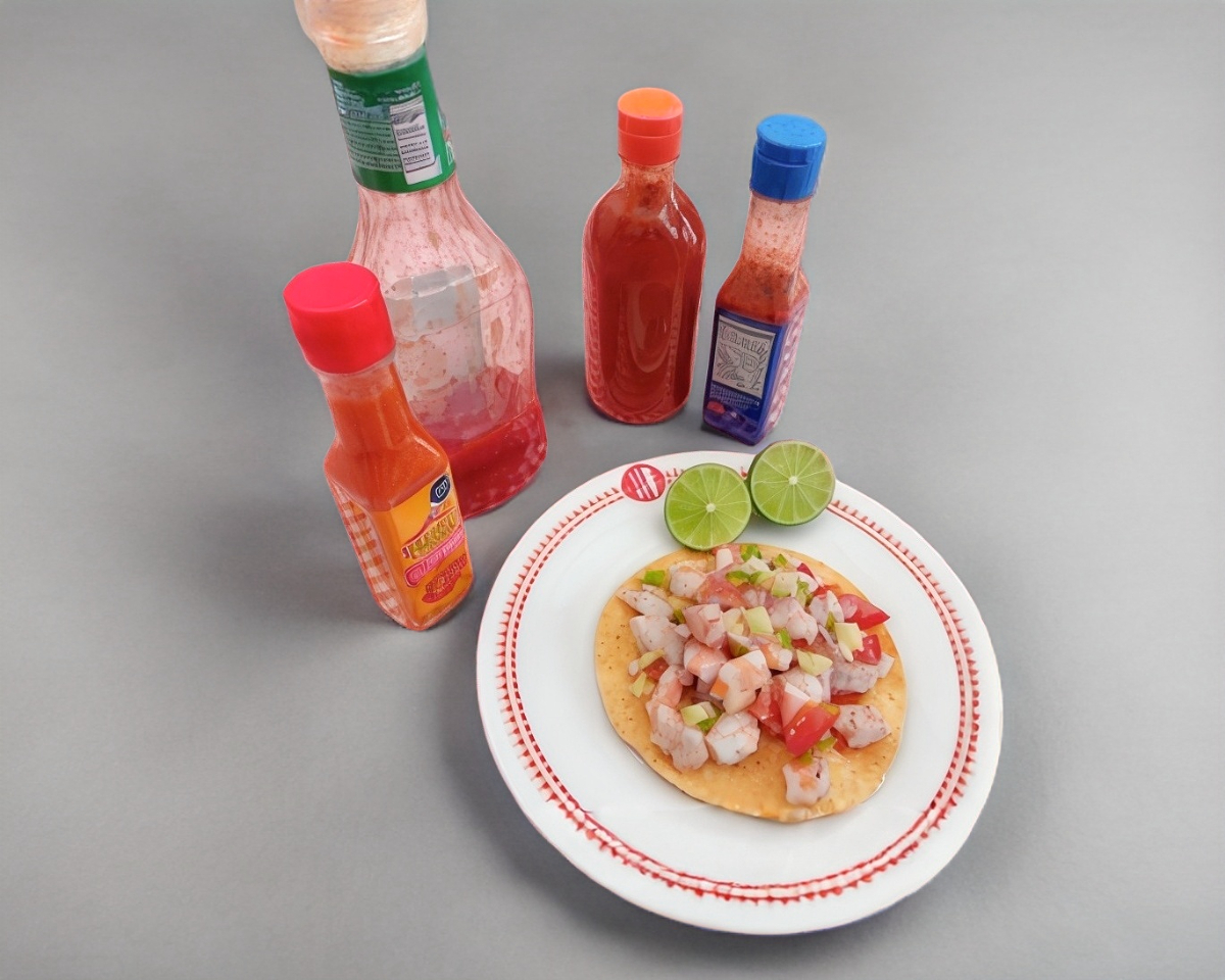 Tostitos con ceviche de camarón, aguacate, salsa, catsup, mayonesa y limón