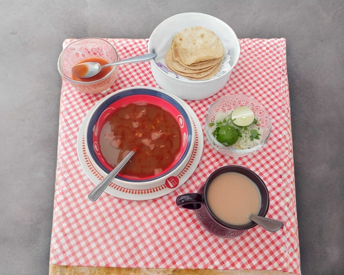 Barbacoa tipo birria, complementada con rico consomé, tortillas, cebolla con cilantro y salsa