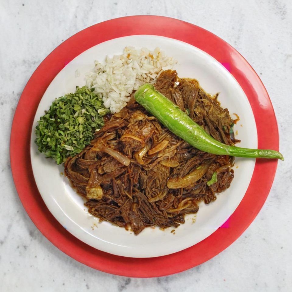 Barbacoa tipo birria, complementada con rico consomé, tortillas,cebolla con cilantro y salsa