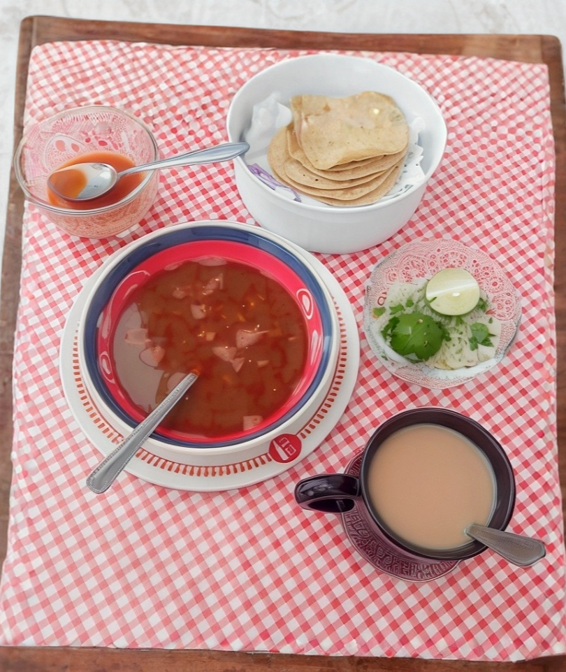 Marlin precocido y guisado con pico de gallo, camarones y caldo de camaron, tostadas, catsup, salsa valentina.