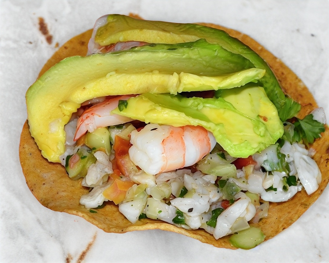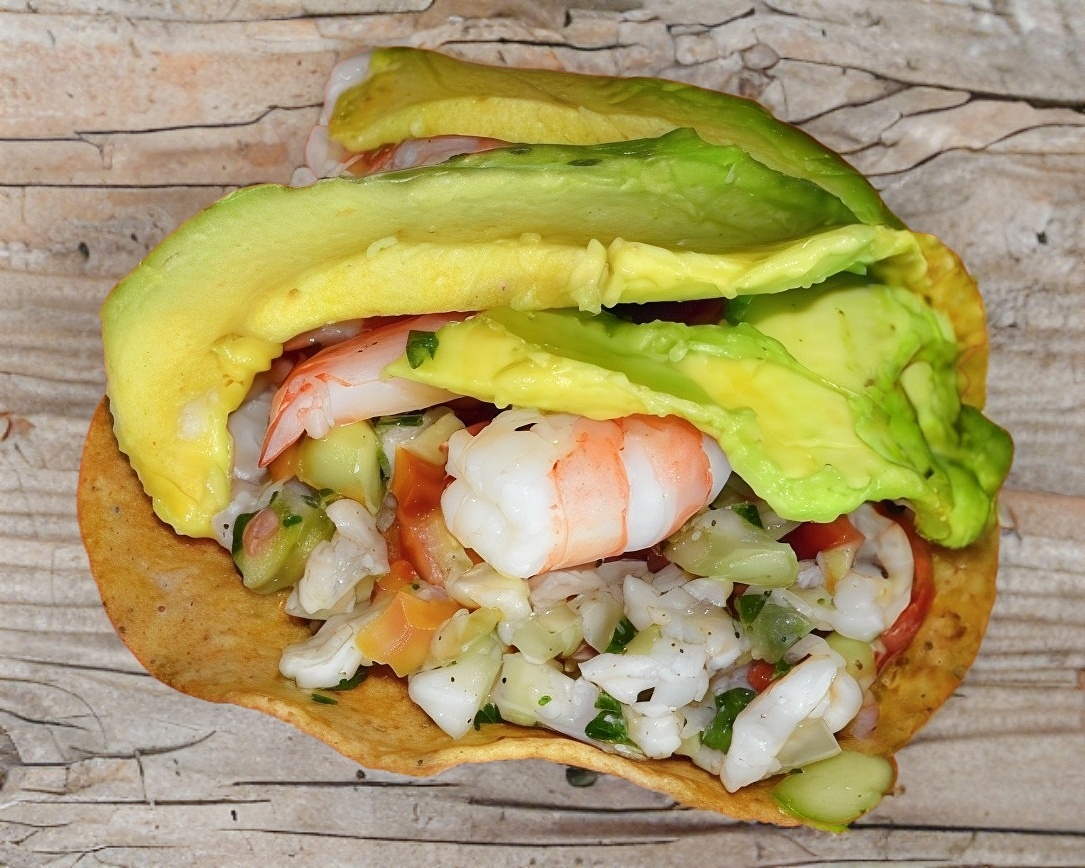 Camarón crudo, camarón cocido, callo de almeja, pulpo y ceviche de pescado.