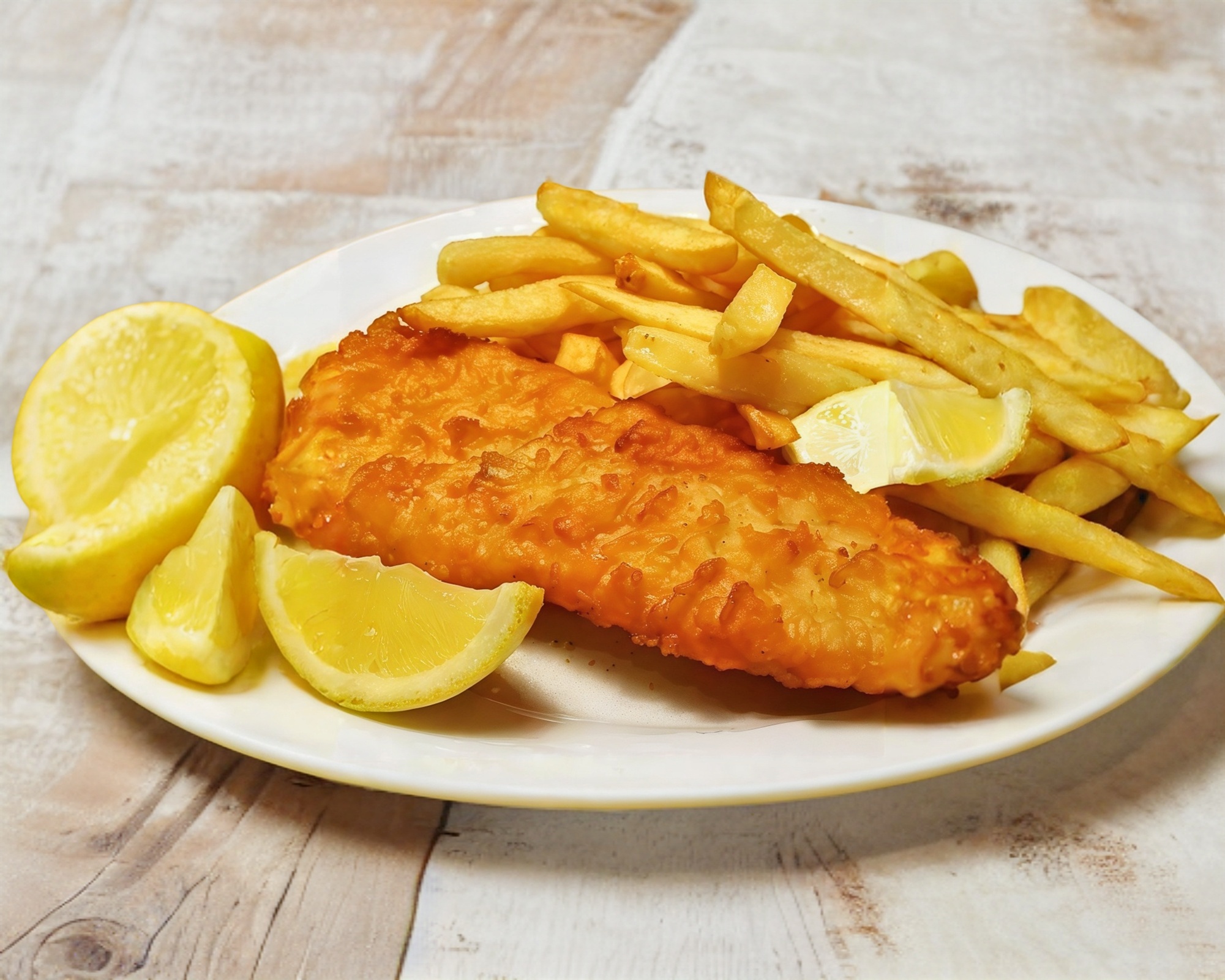Filete de pescado empanizado, acompañado de papas fritas y ensalada.