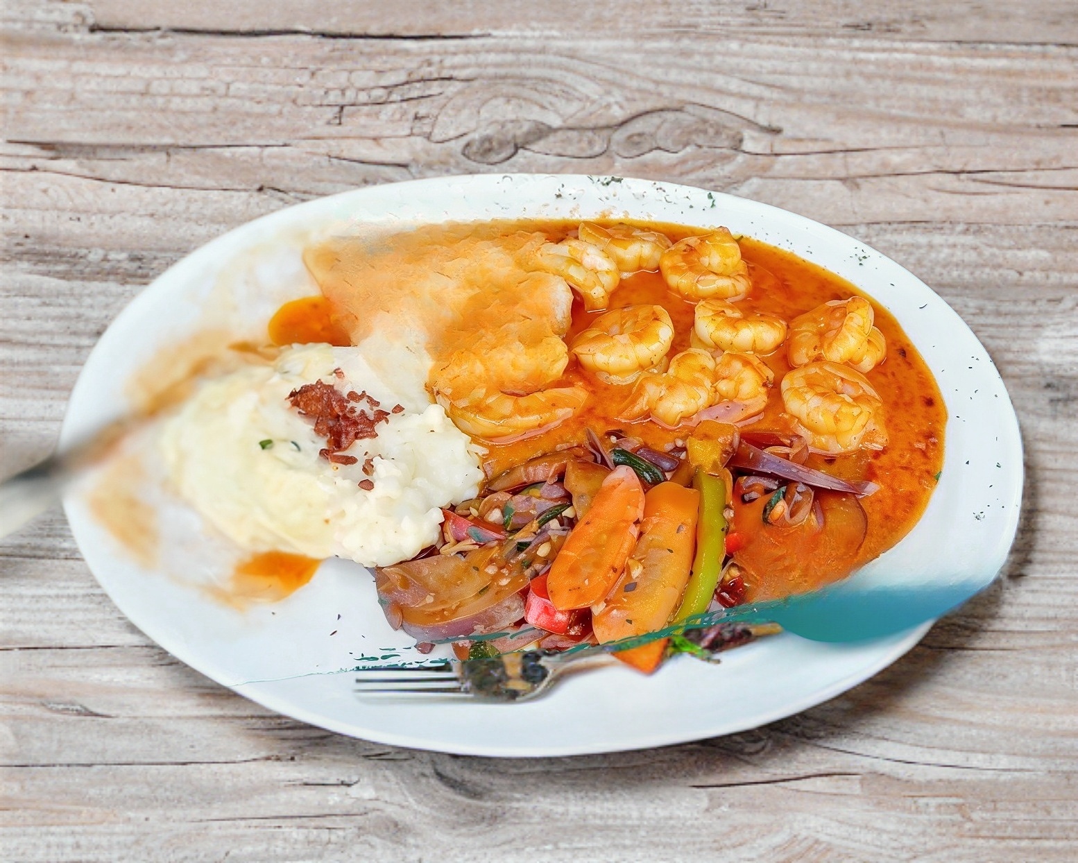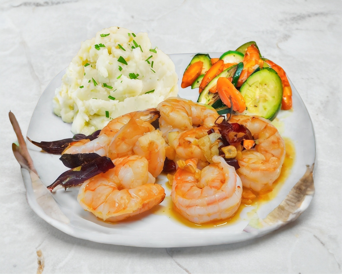 Servidos en salsa mantequilla, chiles morrones, bañados en salsa de la casa acompañados de puré de papa y verduras.