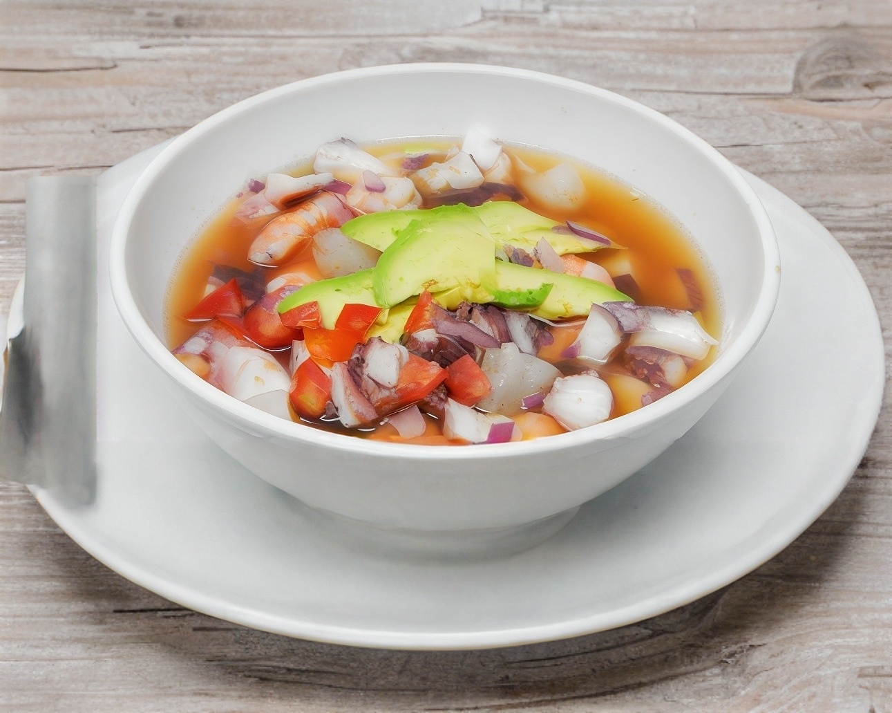 Camarón cocido, pulpo, callo de almeja, ostión, servido en caldo natural de camarón