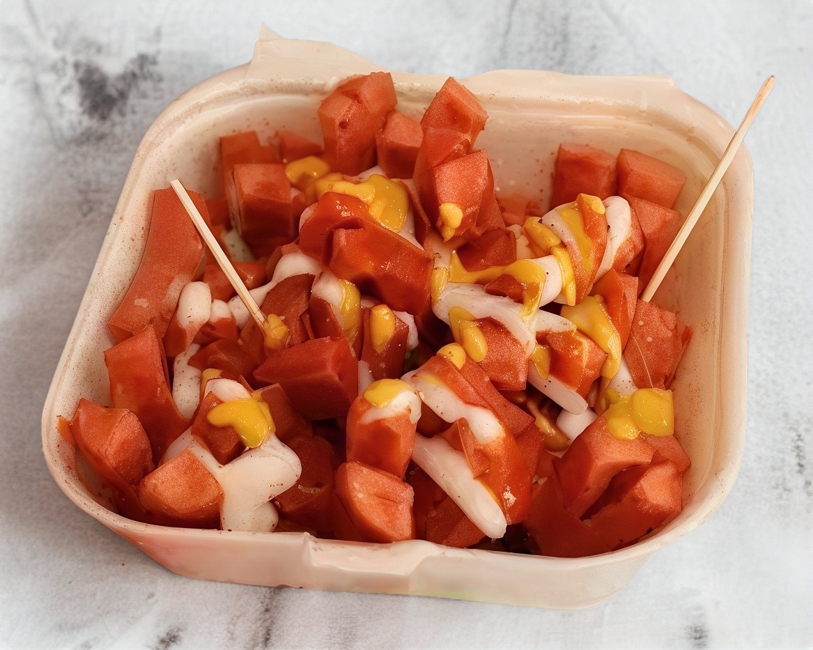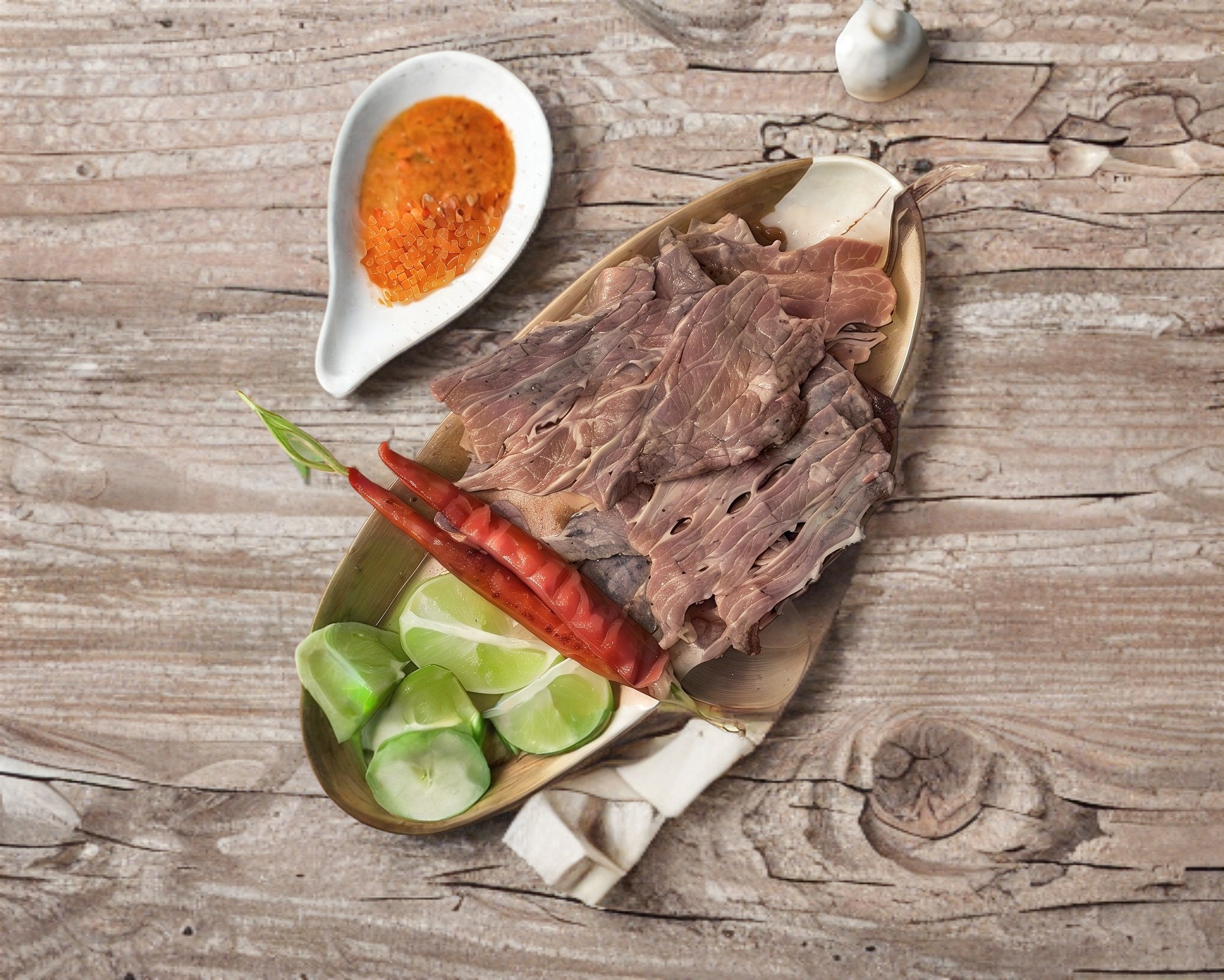 Pecho de res ahumado con un toque de salsa Bbq y queso, ensalada de col y penca de tocino, acompañado de papas fritas.