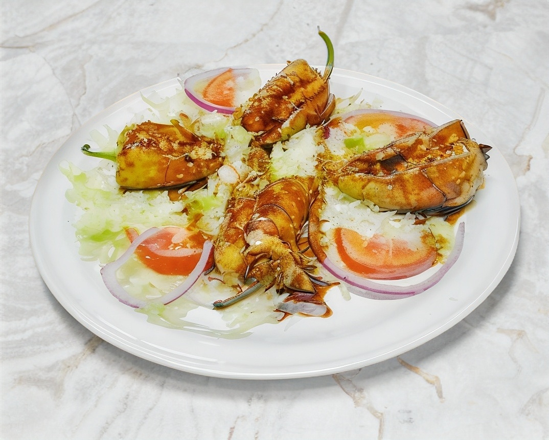 Cocidos o al natural, sal de grano, cebolla morada pepinos y salsa langostinos.
