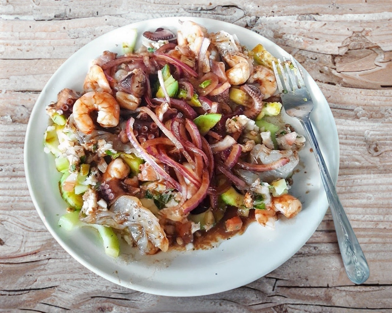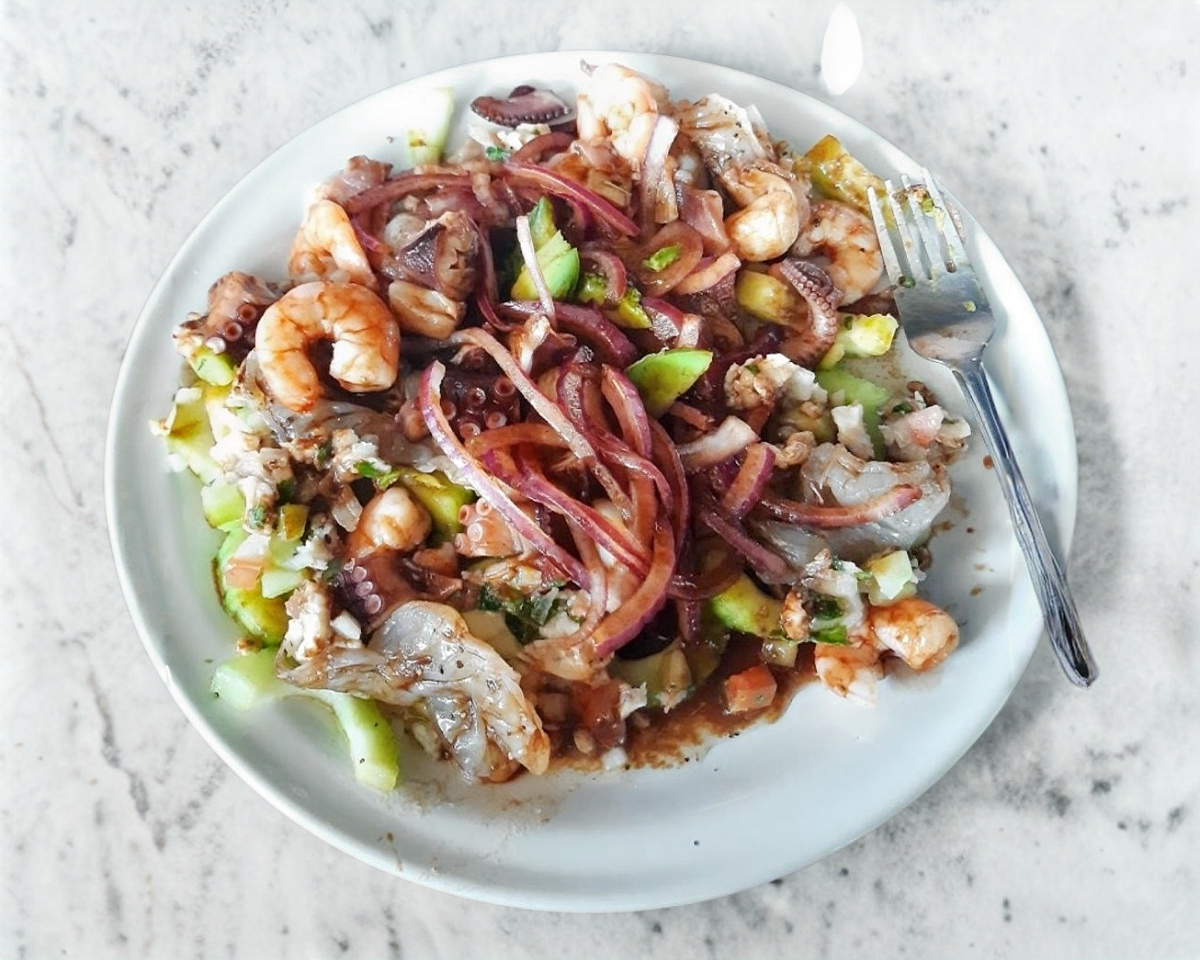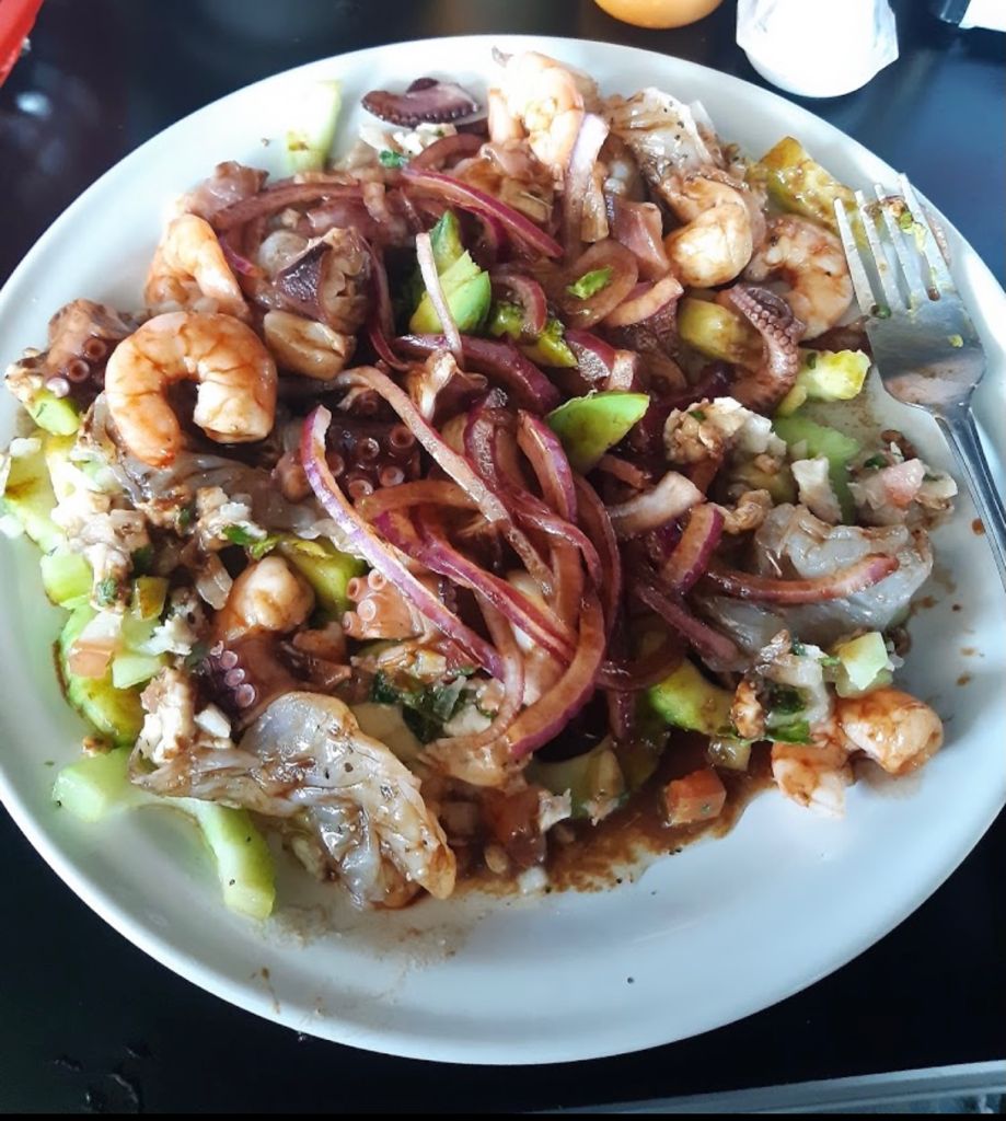 Camarón, pescado, pulpo, callo de almeja, y ostión.