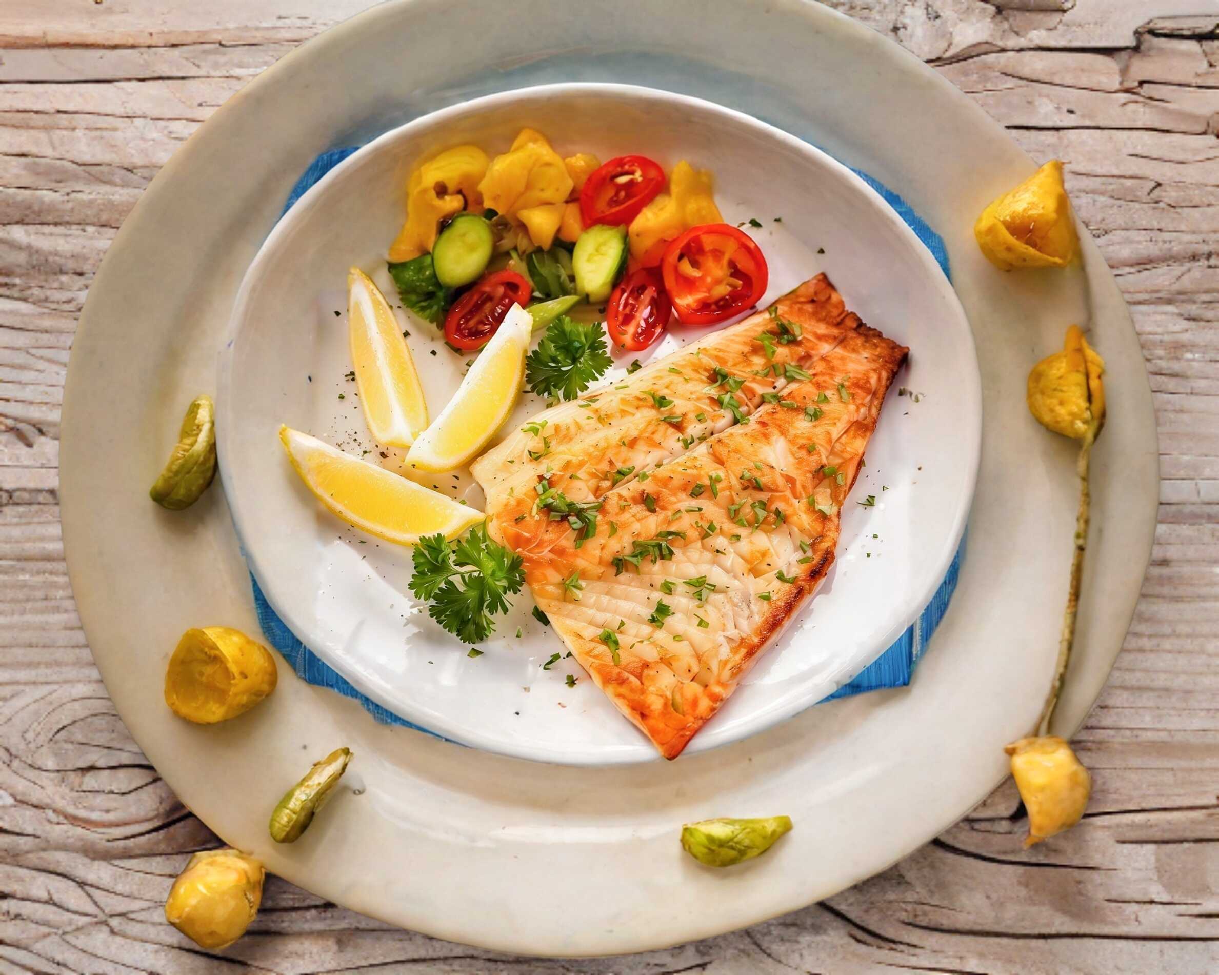 Filete de pescado bañado en salsa de la casa, acompañado de pure de papá y verduras.