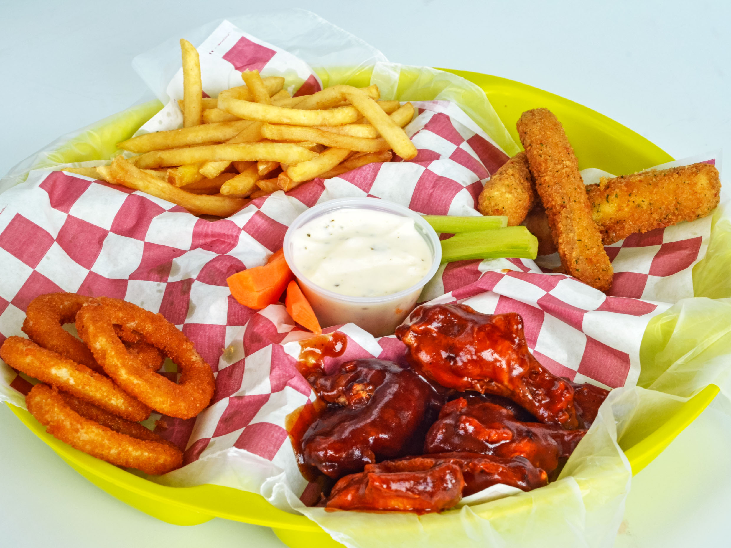 5 Alitas, papas fritas 125 gramos, aros de cebolla 4 piezas, dedos de queso 3 piezas.