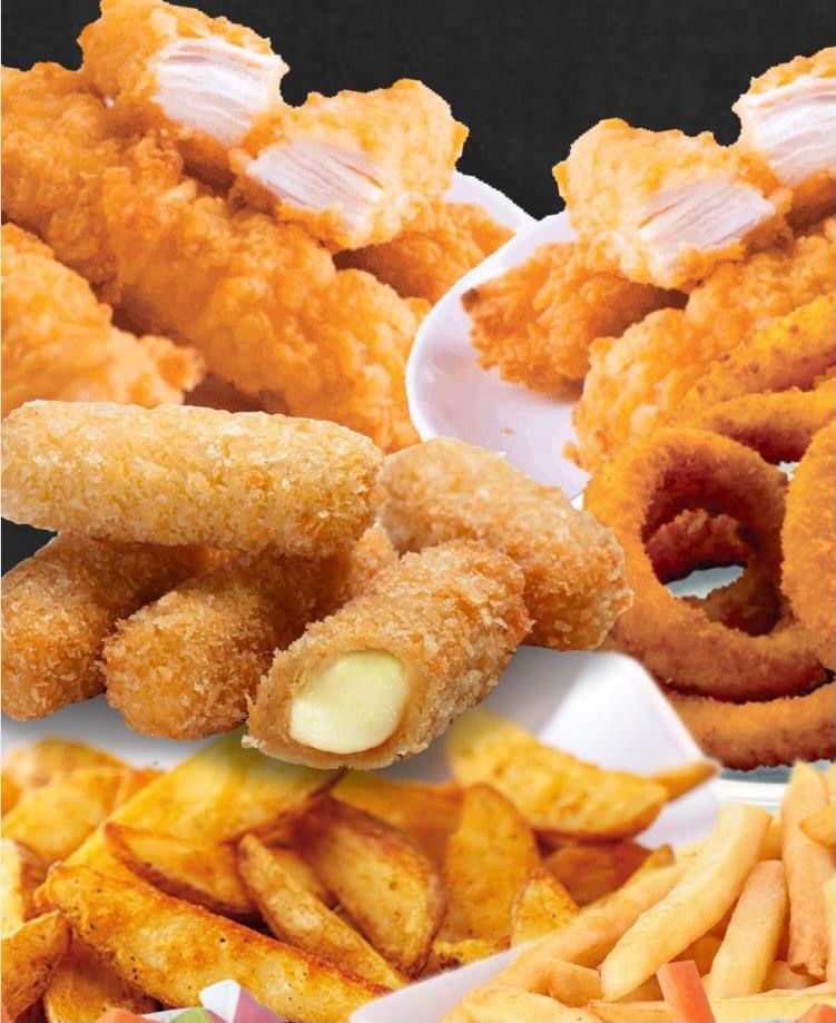 Boneless 140 gr, 130 gr de papas fritas, 4 piezas de aros cebolla, y 3 PZ de dedos de queso.