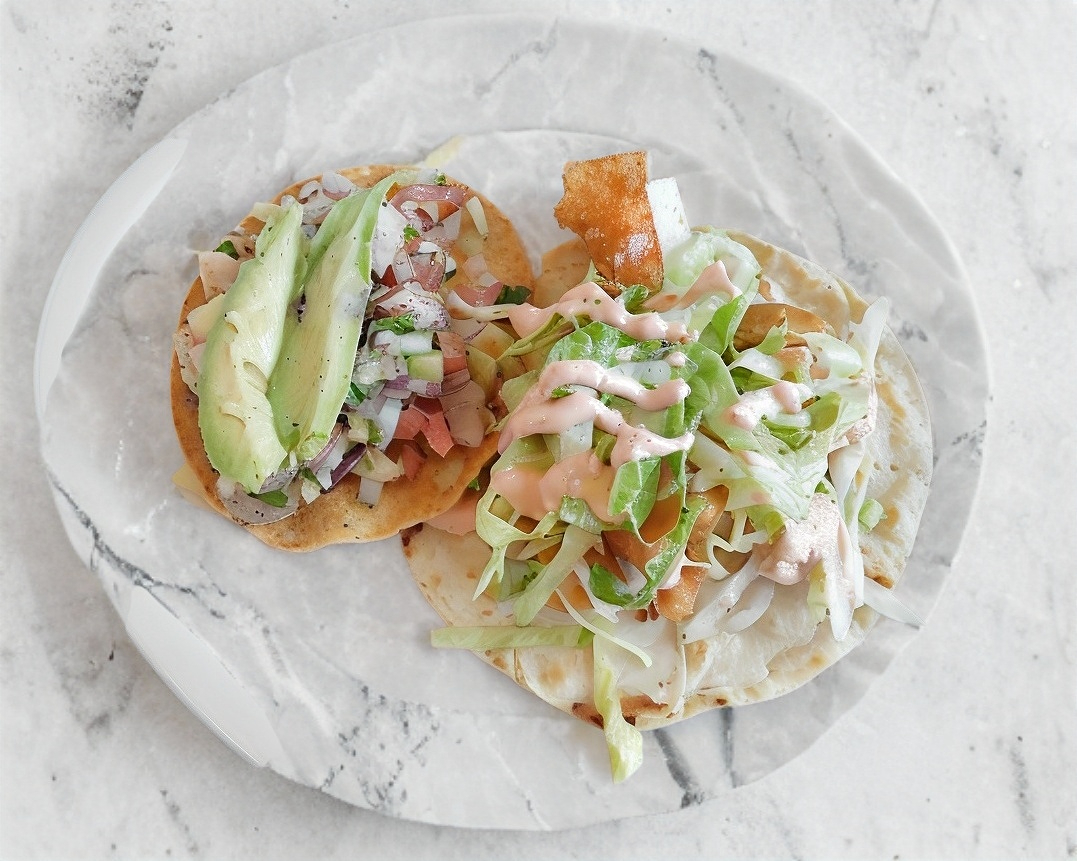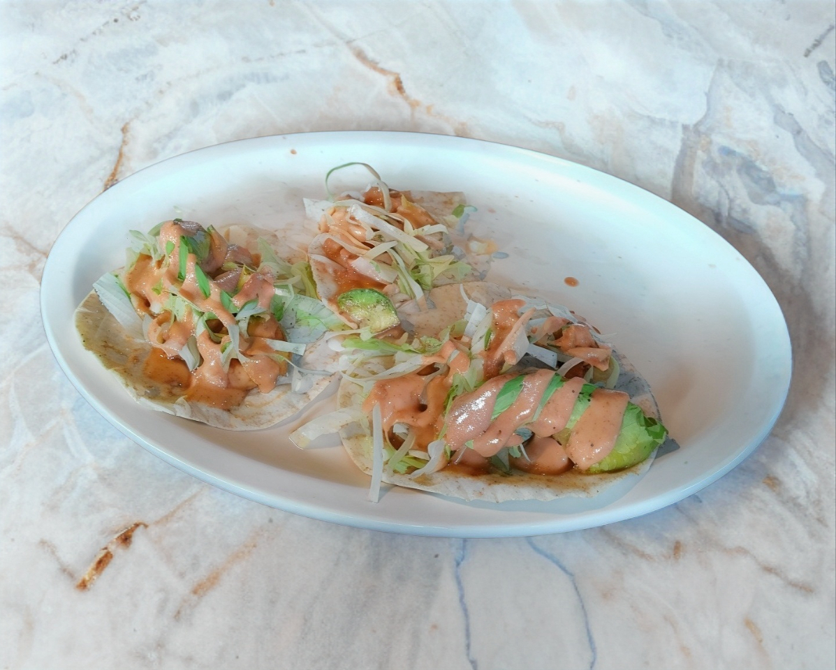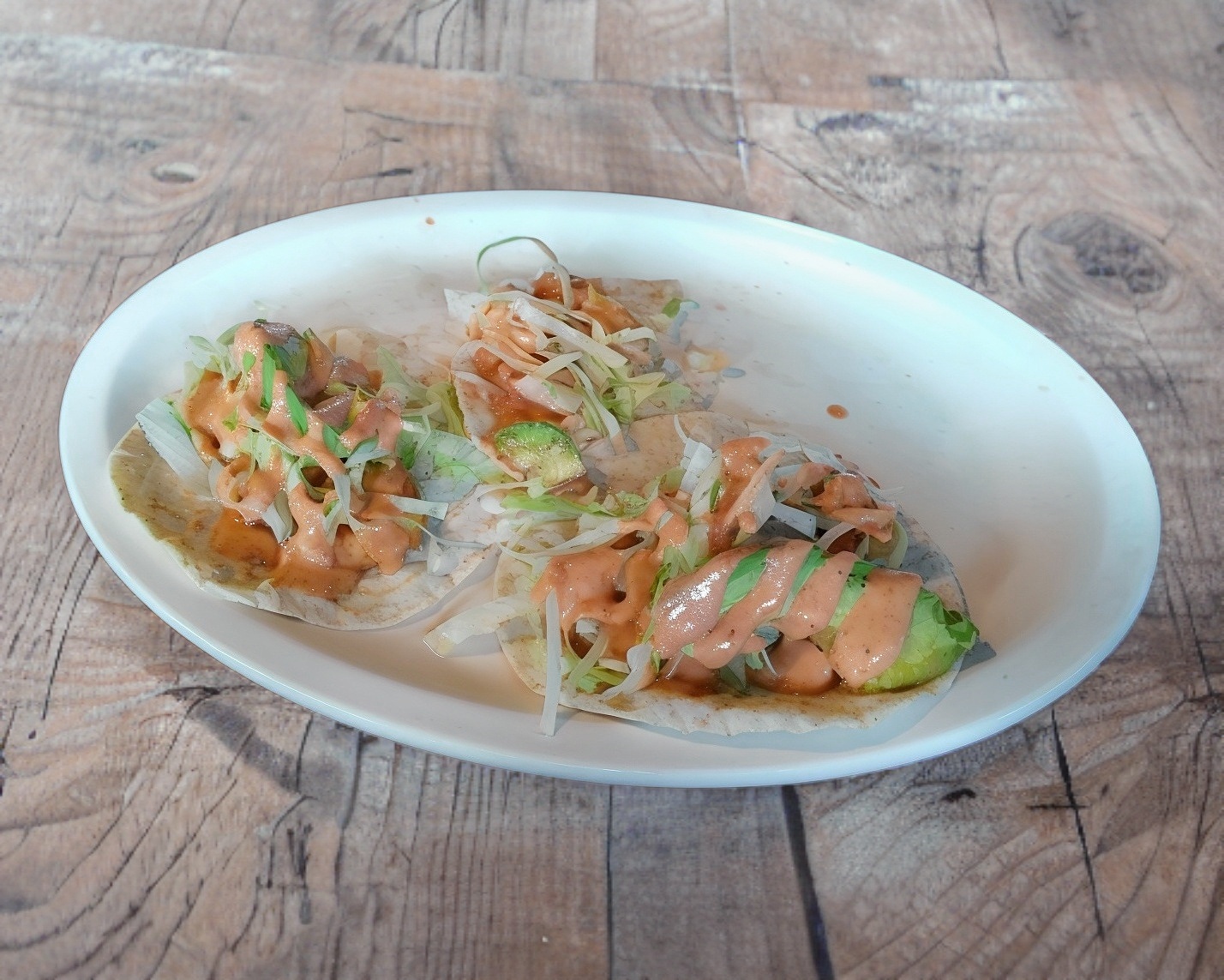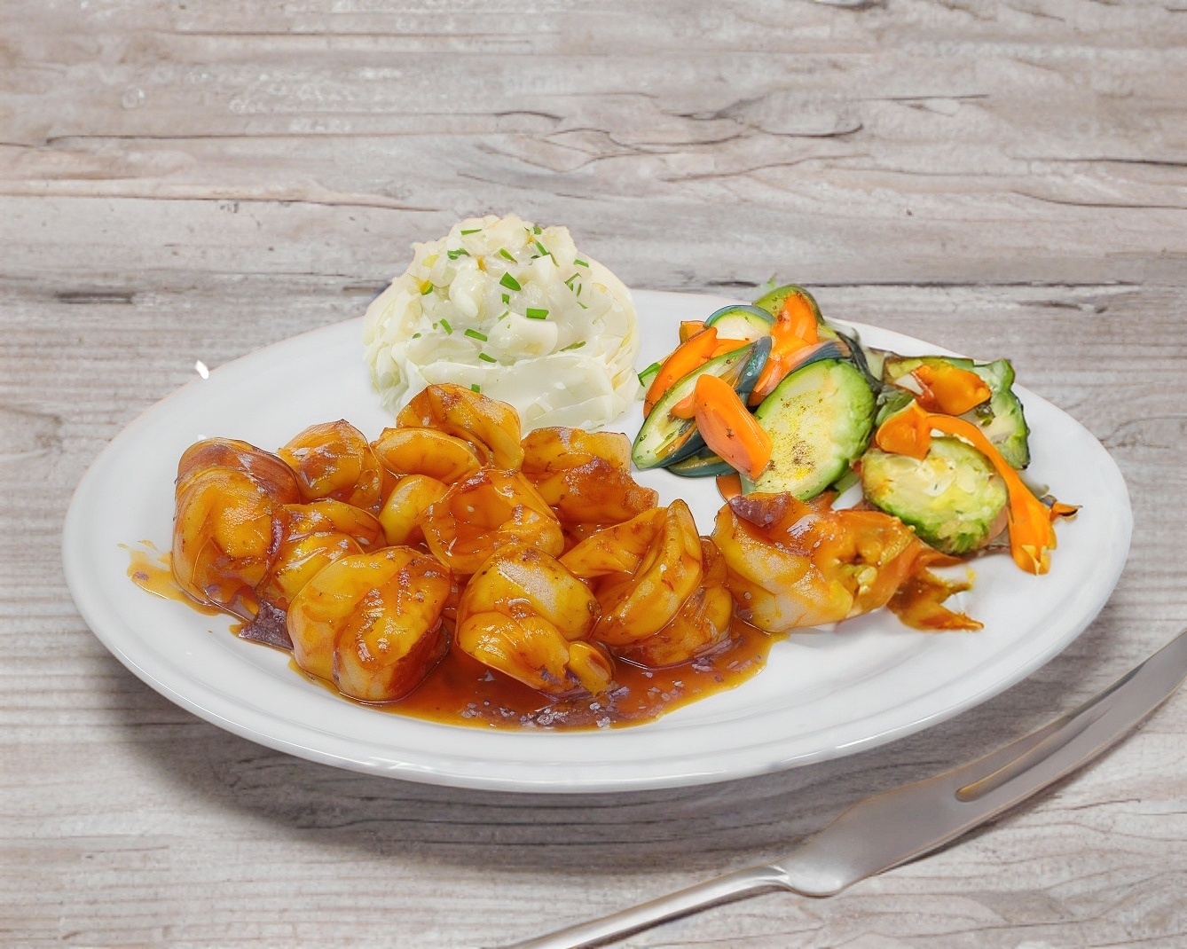 Bañados en salsa de mango chipotle casera, acompañados de pure de papa y verduras.