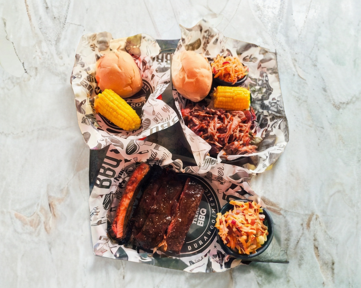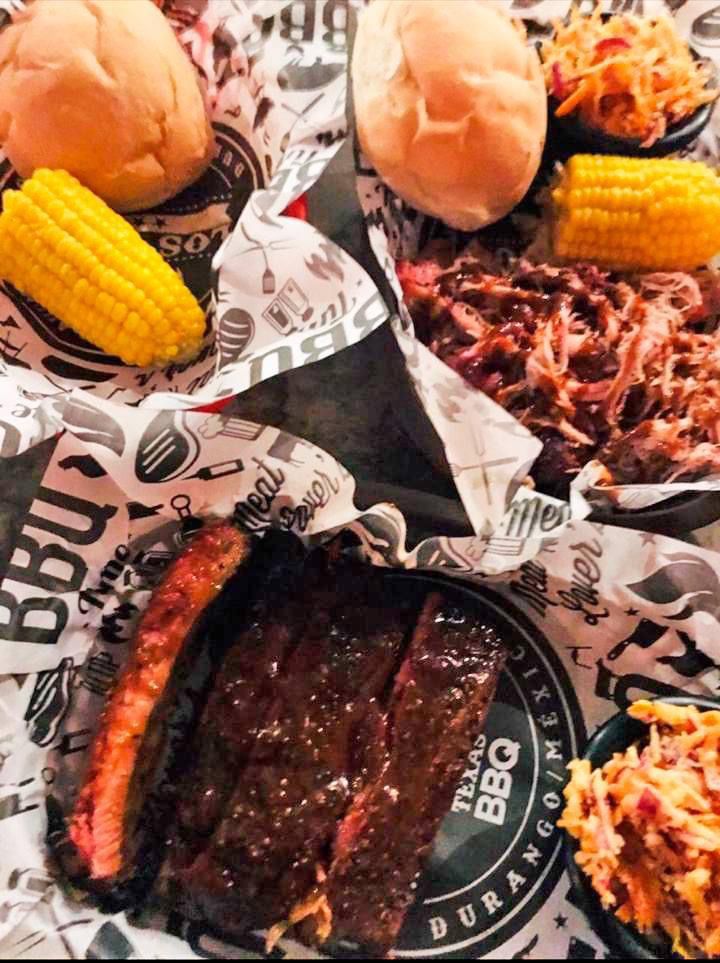 Hombro de cerdo ahumado bañado en salsa bbq y queso, acompañado de ensalada de col y papas fritas.