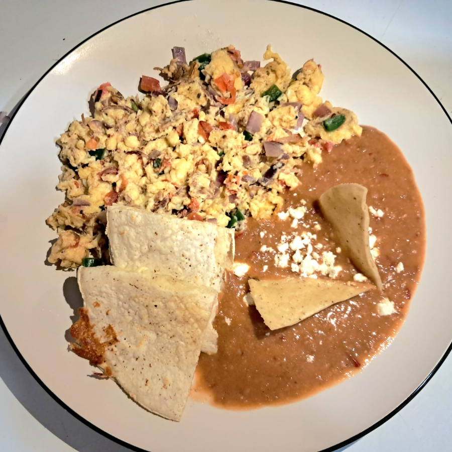 Riquisimos huevos revueltos con carne seca y pico de gallo. Todos los desayunos incluyen frijoles y tortillas.