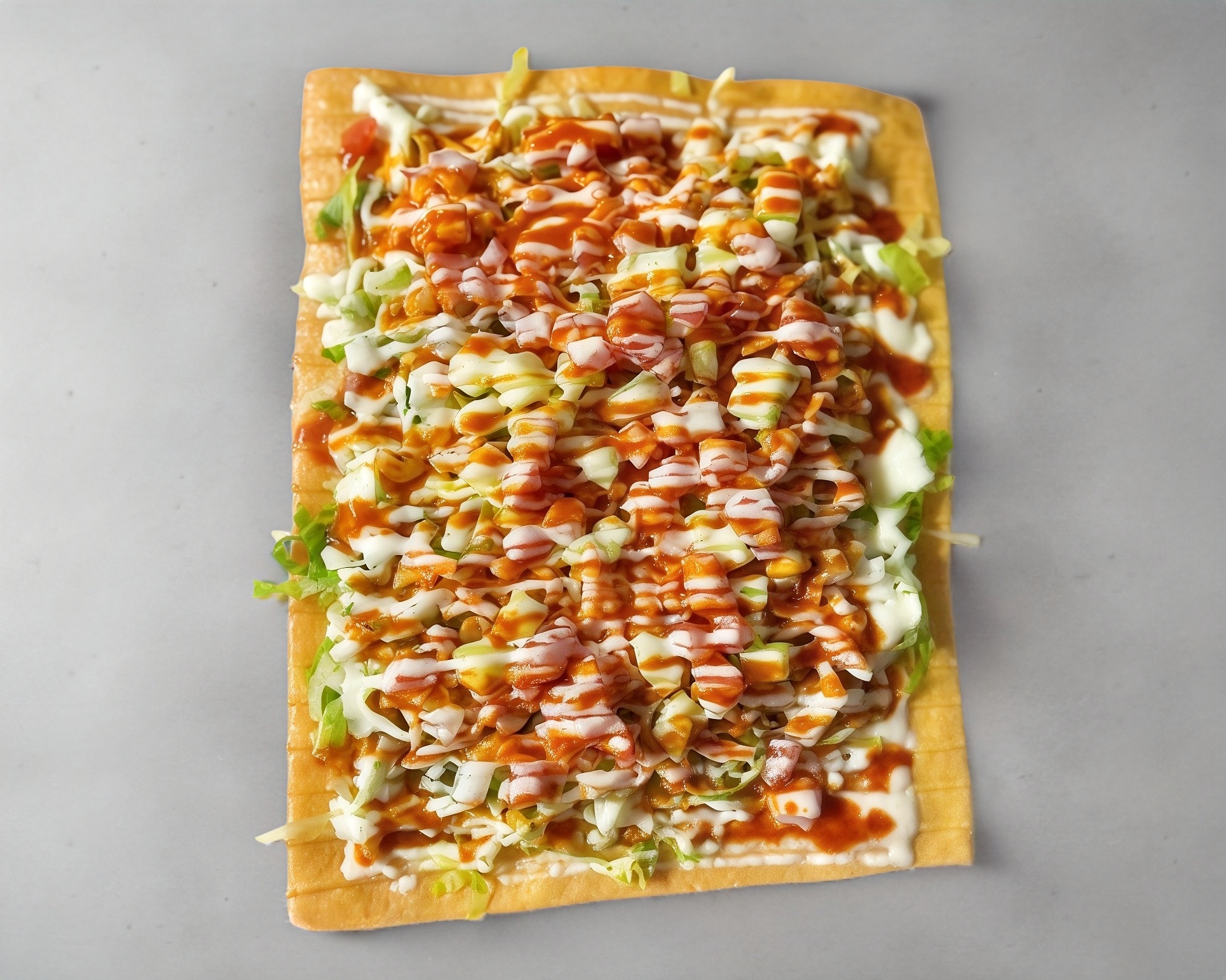 Lechuga, pepino, zanahoria, cueritos, limon, salsa y crema. La fritura cambia dependiendo del tipo de fritura disponible en tienda, puedes elegir si quieres con chile o sin chile