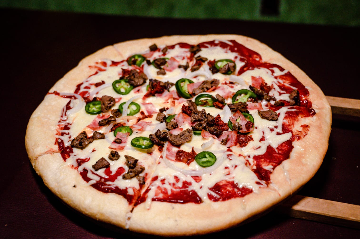 Chorizo, jalapeño, carne, tocino, cebolla, salsa secreta (Picante)