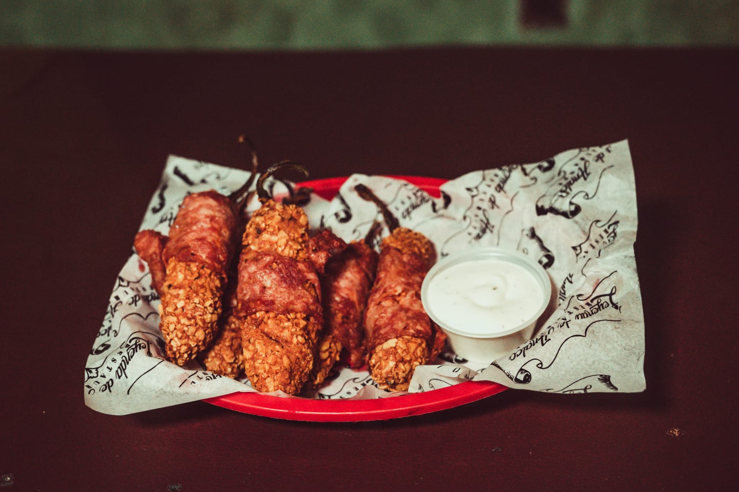 Chile jalapeño entero, relleno de queso blanco, empanizados con Doritos, envueltos en tocino fritos y acompañados de aderezo ranch.