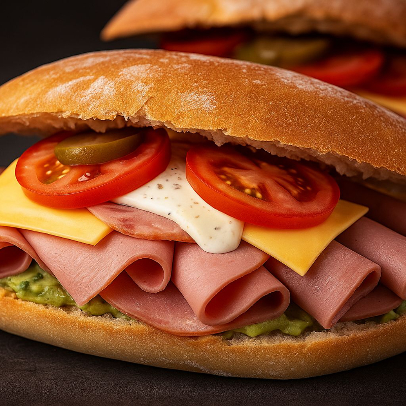El favorito de siempre. Jamón fresco con aguacate, mayonesa, mostaza, chile, tomate y cebolla.