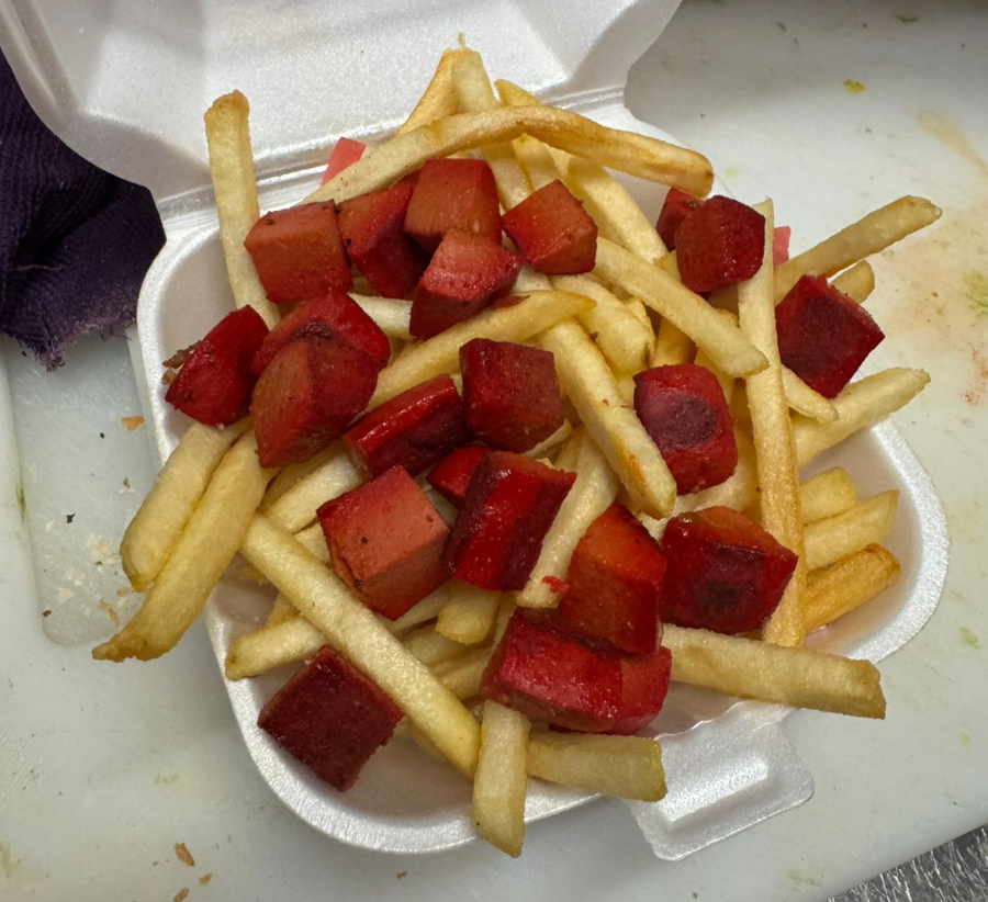 Un clásico reinventado: papas a la francesa acompañadas de trozos de salchicha para asar. ¡Ideales para compartir o disfrutar tú solo!