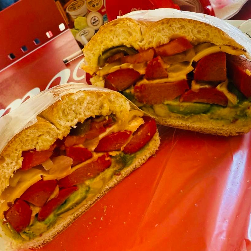 Clásico y delicioso. Pierna suave y jugosa acompañada de aguacate, queso blanco, mayonesa, mostaza, chile, tomate y cebolla.