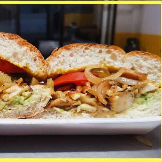 Una opción ligera, pero llena de sabor. Pollo tierno con aguacate, queso blanco, mayonesa, mostaza, chile, tomate y cebolla.