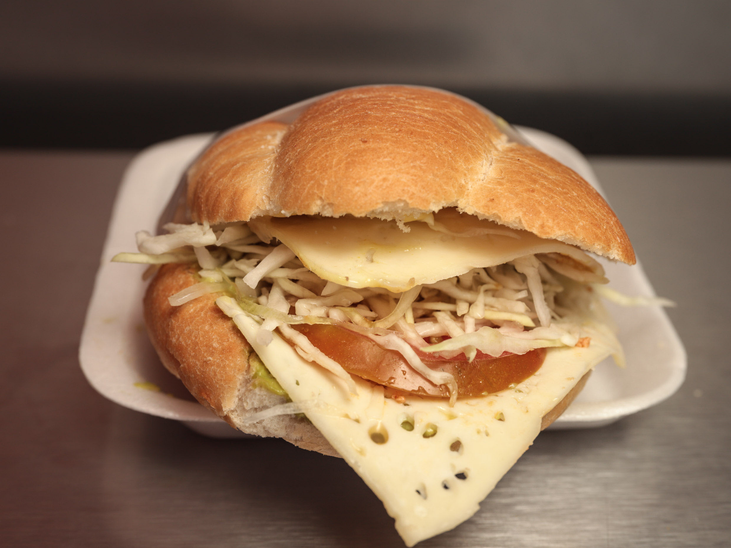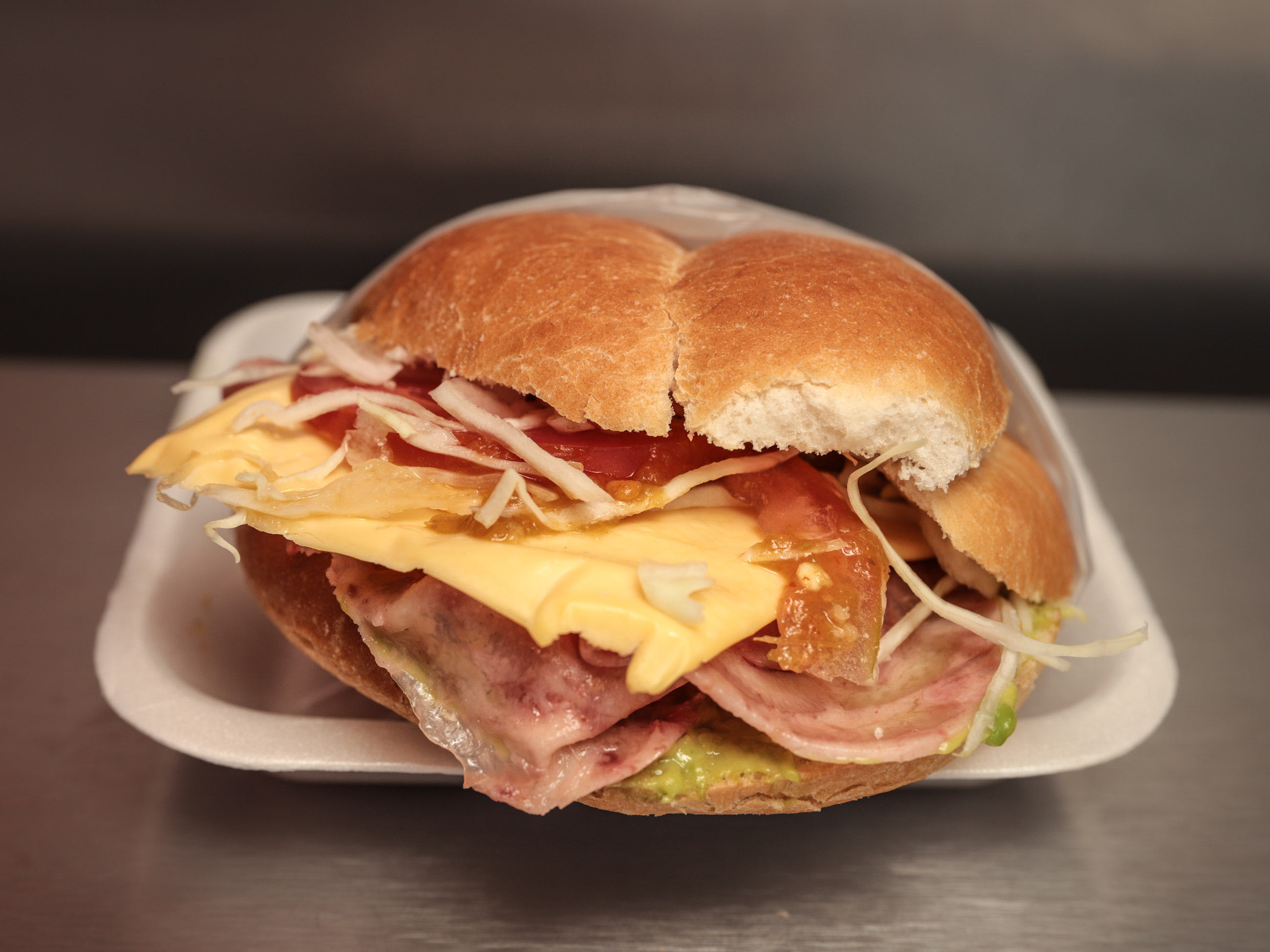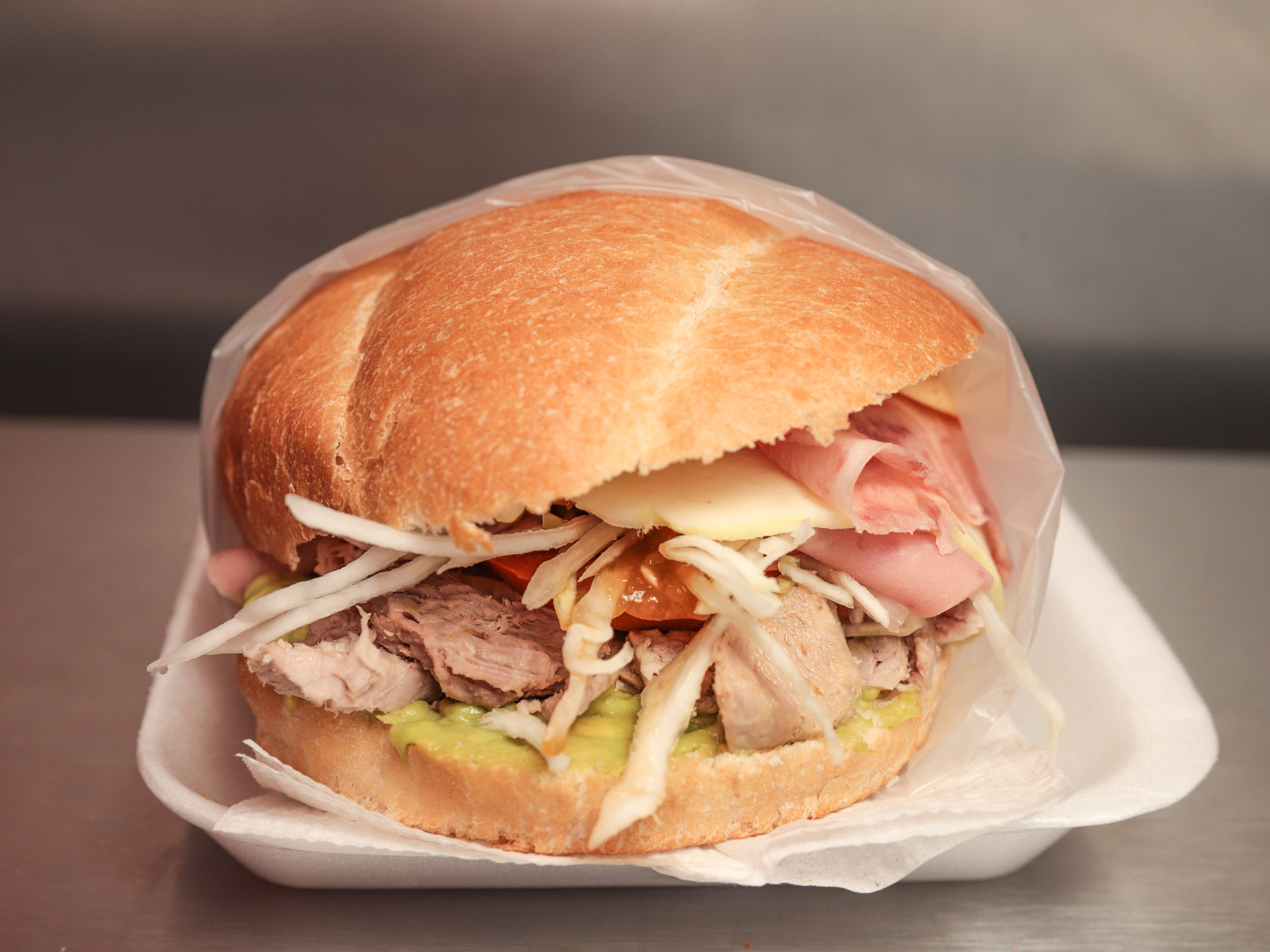 Jamón, queso de puerco, queso blanco y queso amarillo.
