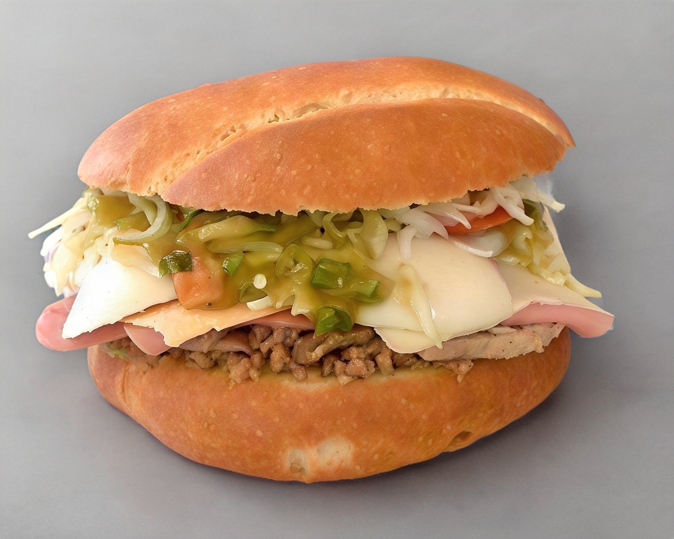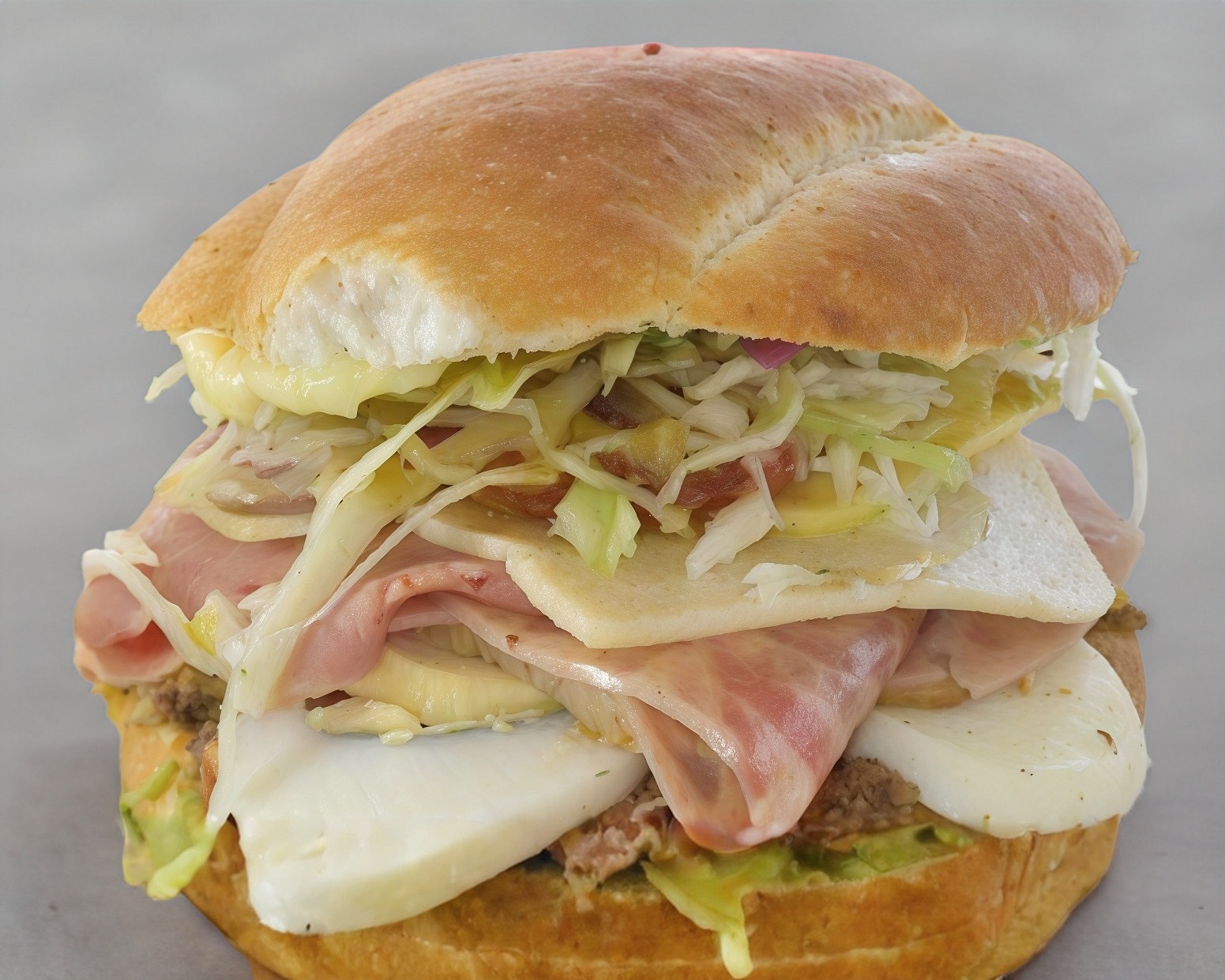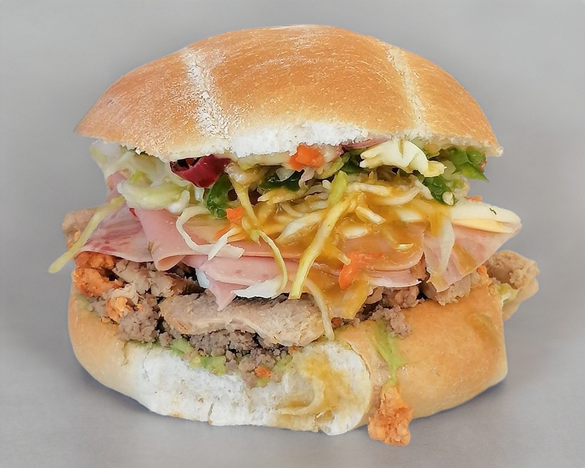 Jamón, queso puerco, queso amarillo queso blanco y pastel de pollo..