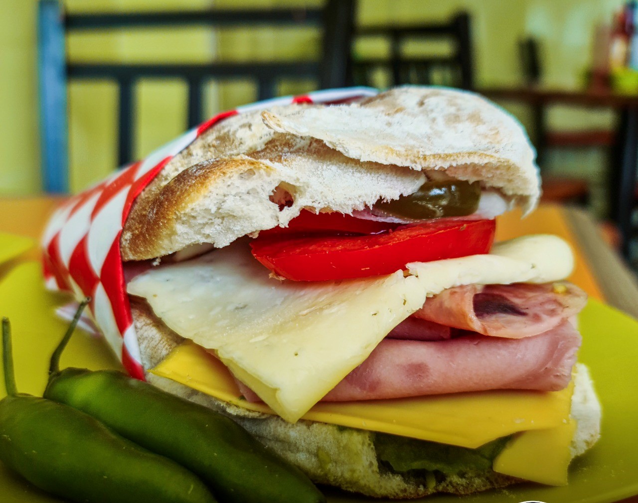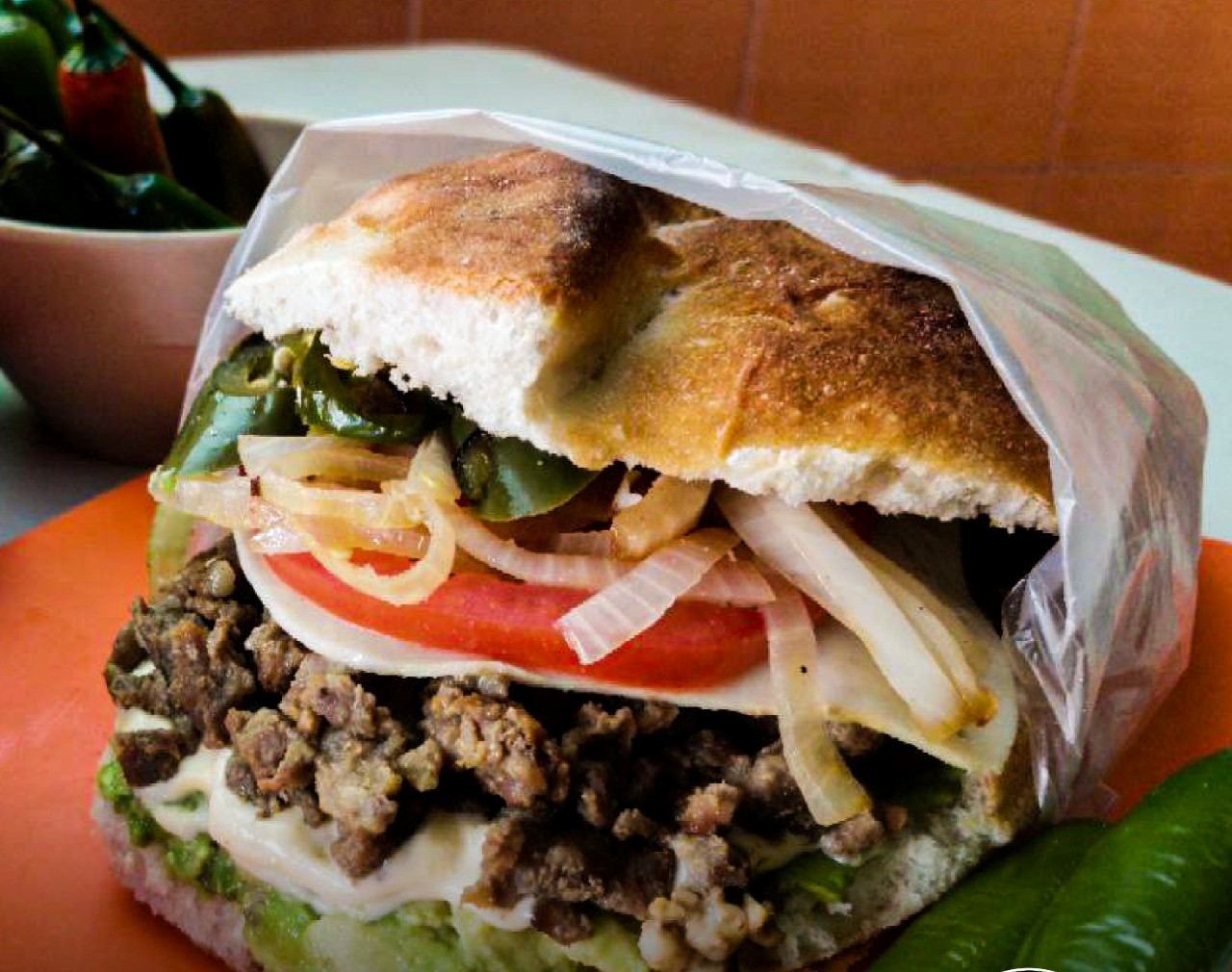 Lonche de Pierna, aguacate y queso blanco. acompañado de chile, tomate, cebolla, mostaza y mayonesa por aparte. (Porción personal).