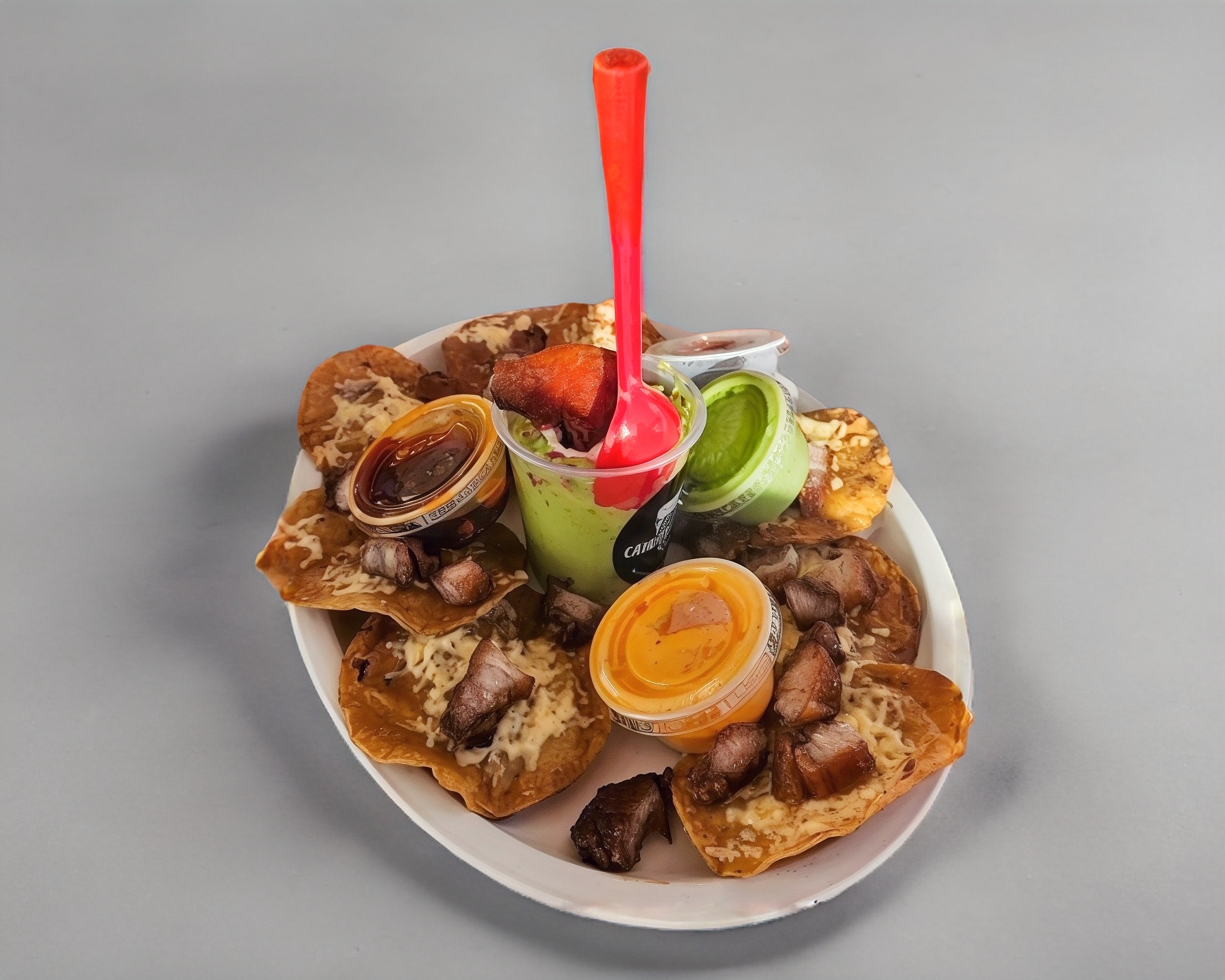 8 pza Tostaditas Rancheras con Queso Asadero, Guacamole, Chicharron de la Ramos & Salsitas.