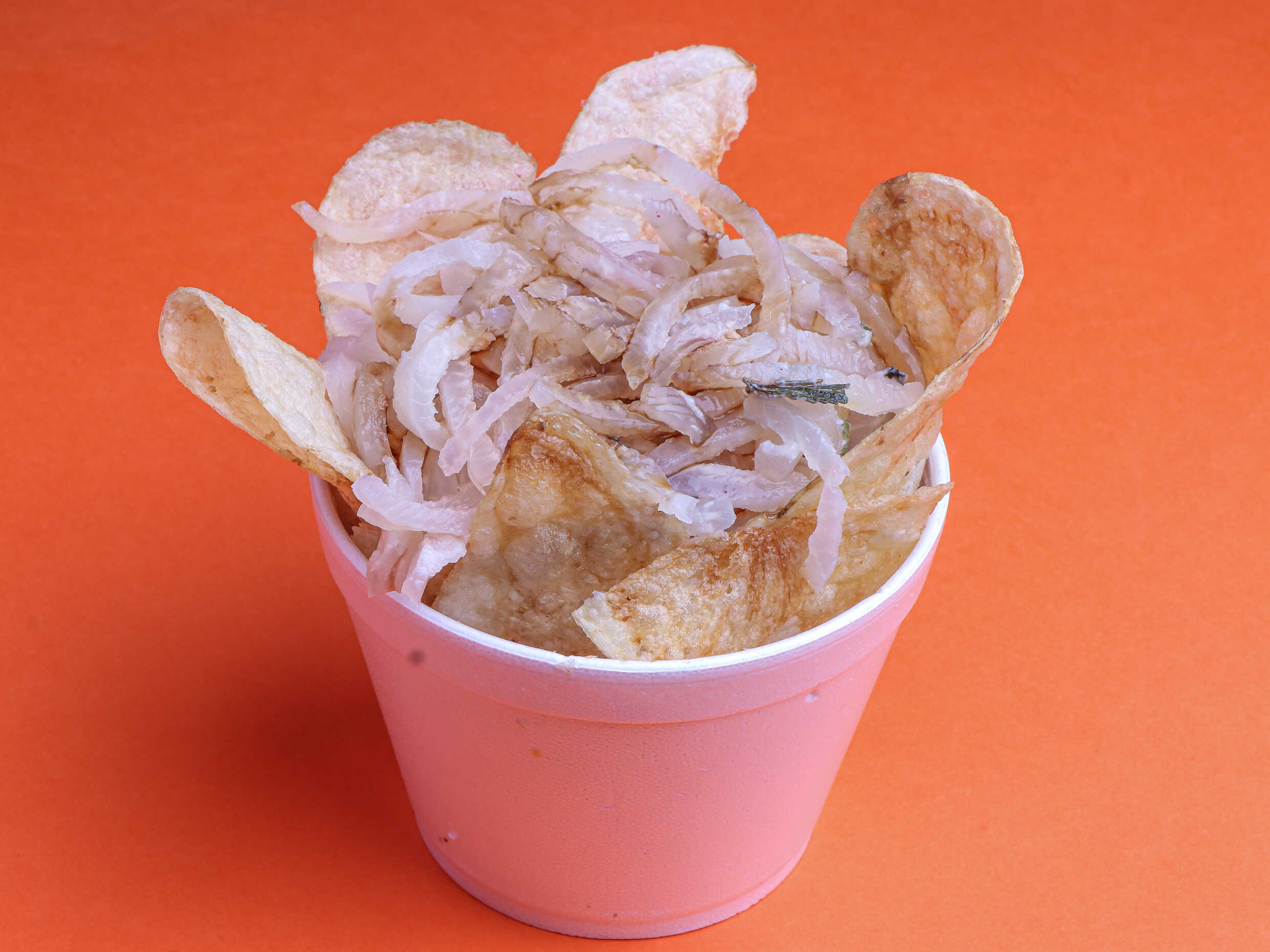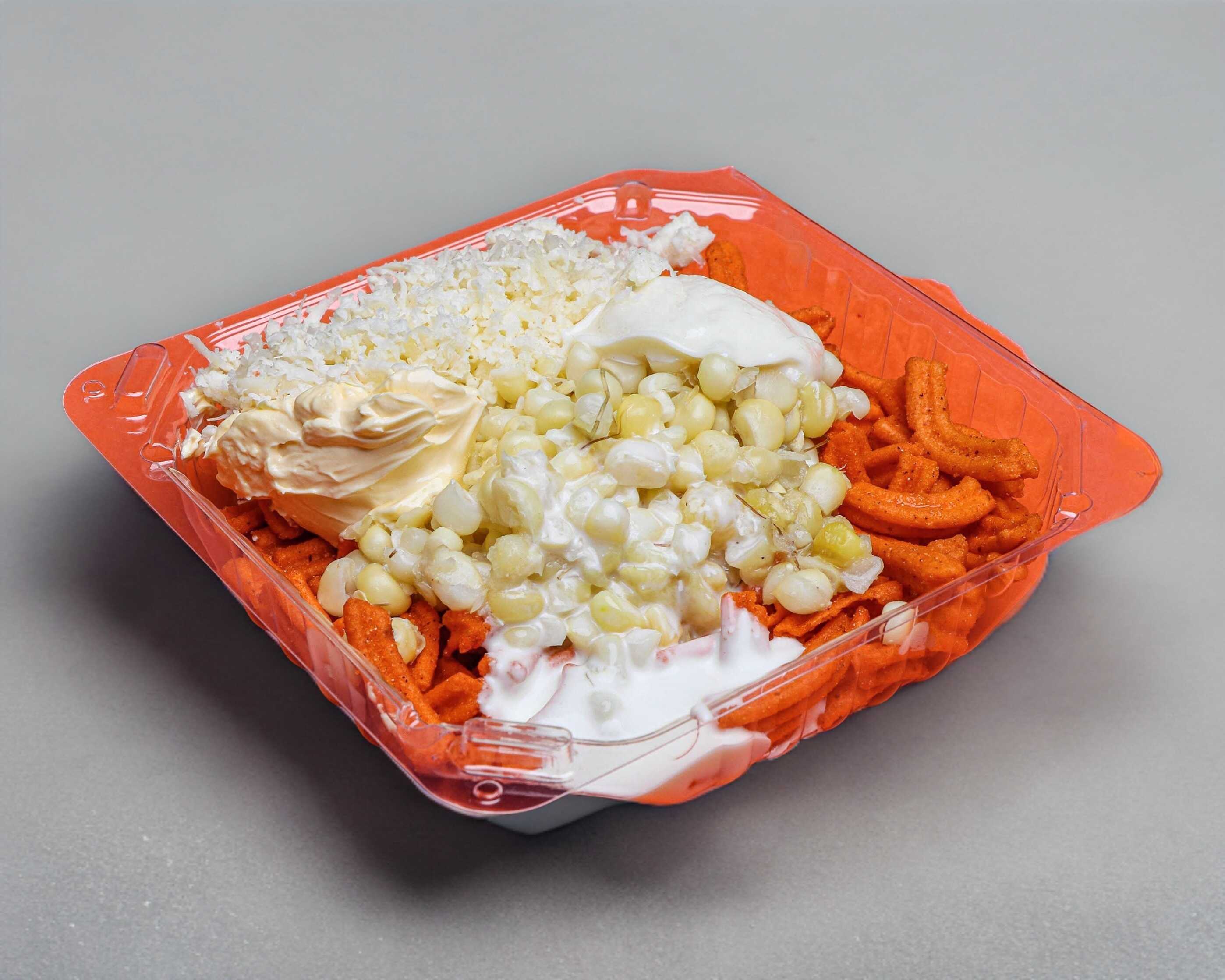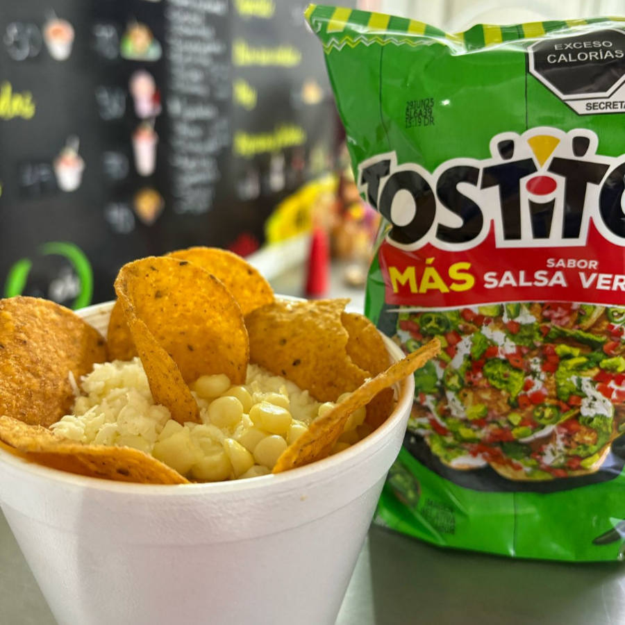 Delicioso elote preparado acompañado de tostitos a tu gusto.